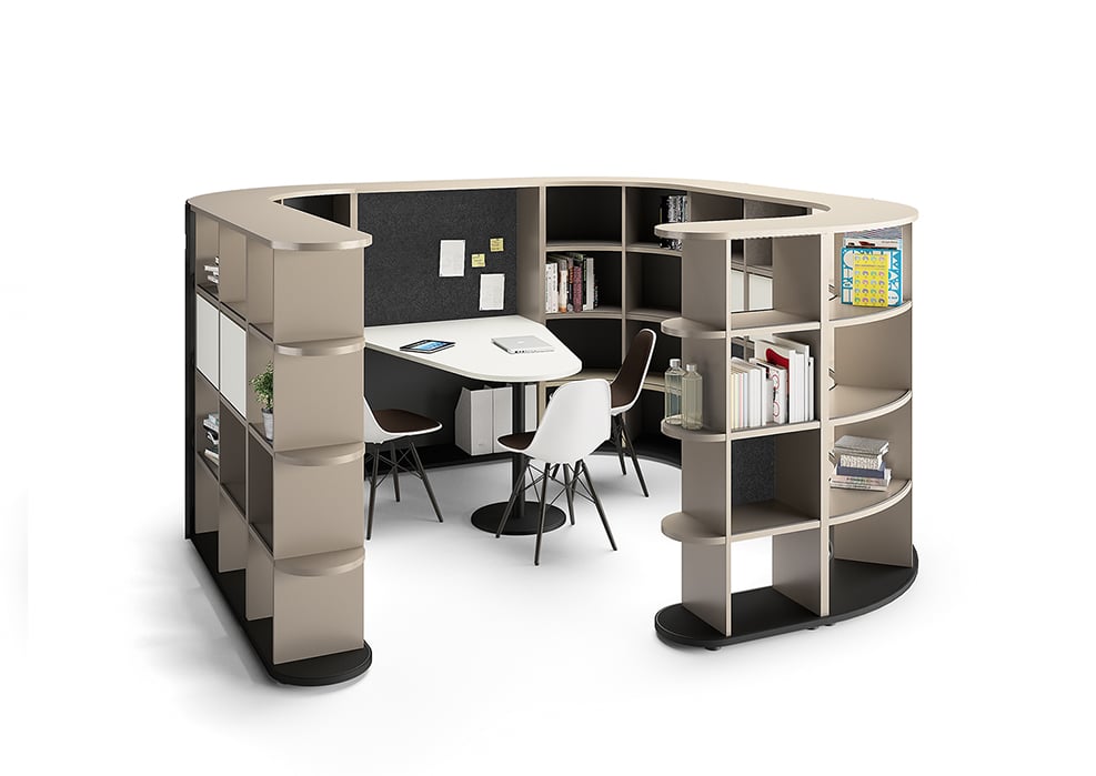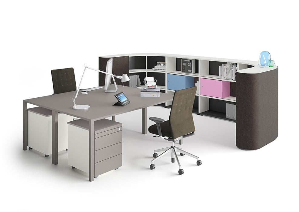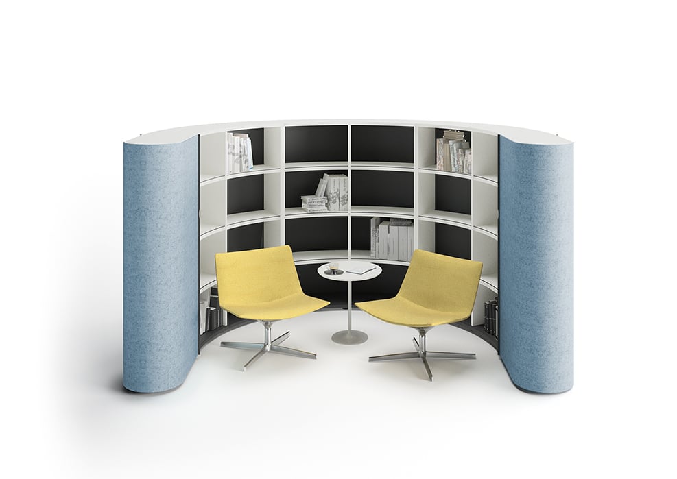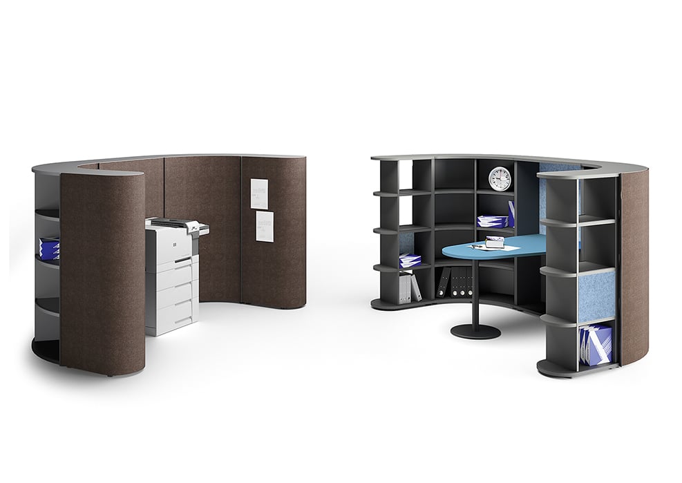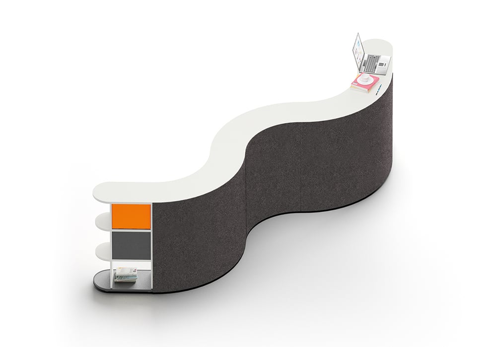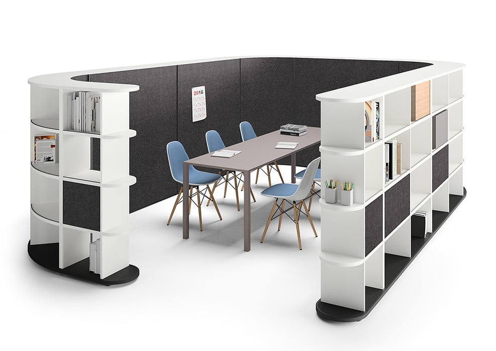 Das Büroregal als wesentlicher Bestandteil des architektonischen Gesamtkonzeptes – Das ist die Idee von 'basic flow'. Gerade und gebogene Regalelemente lassen sich vielfältig kombinieren, Materialien und Farben eröffnen Gestaltungsvielfalt. Im Mittelpunkt des Regalsystems steht das einzigartige Jalousieprinzip: Eine akustisch wirksame Front aus Filzmaterial, die sich über mehrere Elemente verschieben lässt. So entstehen attraktive Wechselspiele aus geschlossenen und transparenten Bereichen.