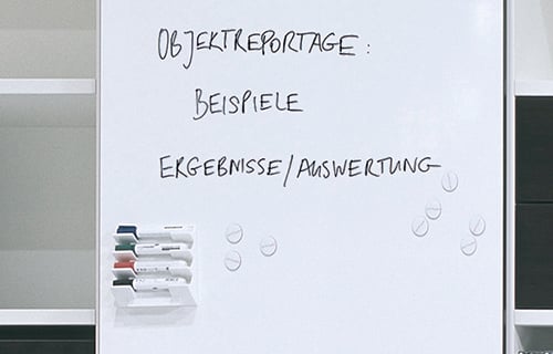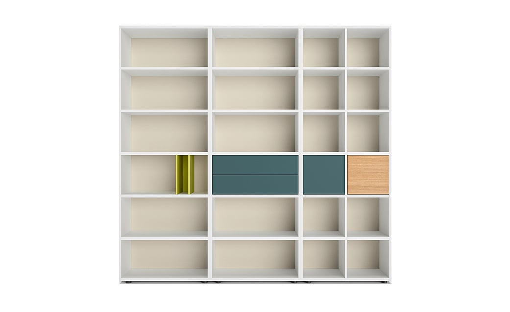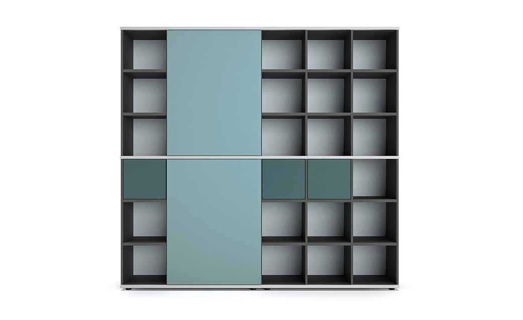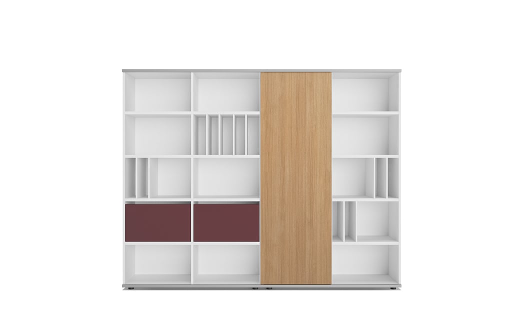 Ob im Objekt oder im privaten Bereich, das 'Regalsystem basic S' passt sich jedem Bürokonzept und Wohnkonzept an. Es präsentiert sich an der Wand oder im Raum und ist dabei so offen, wie die Situation dies erfordert. Vor dem Korpus laufende Schiebetürelemente in durchgehenden oder geteilten Höhen setzen auf Wunsch großflächige Akzente und schirmen den Innenraum ab. Im Wechselspiel mit flächenbündigen Schubläden oder Pushtüren erhält das Büroregal eine dreidimensionale Anmutung.