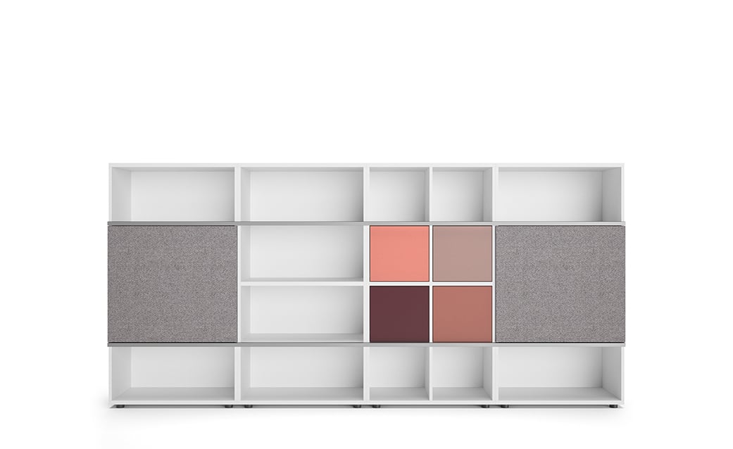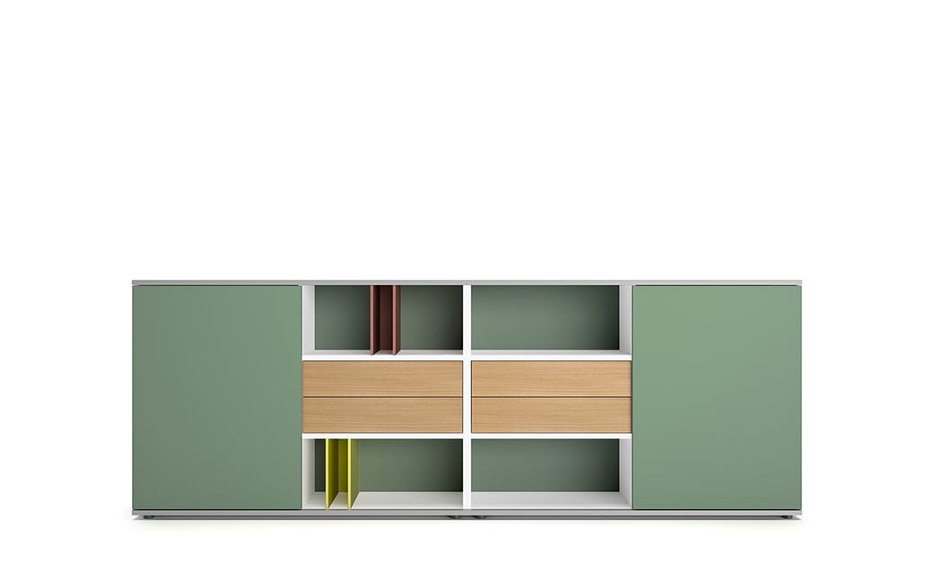 Das 'basic S' Programm steht für Variantenvielfalt aus dem System. Der umfangreiche Sortimentsbaukasten bietet mit verschiedenen Frontlösungen und einem großen Farb- und Materialspektrum viel Gestaltungsspielraum. Schrankkorpus und Fronten sind in 15 Uni- und Holzdekoren sowie in Echtholzfurnier erhältlich. Für die Fronten und die Sichtrückwände stehen zusätzlich Lackoberflächen aus der RAL- und NCS-Farbpalette zur Verfügung. Auch die Varianten Akustik, Stoffbezogen und beschreibbares Whiteboard sind möglich. Fronten in Hochglanz vervollständigen das Materialsortiment.
