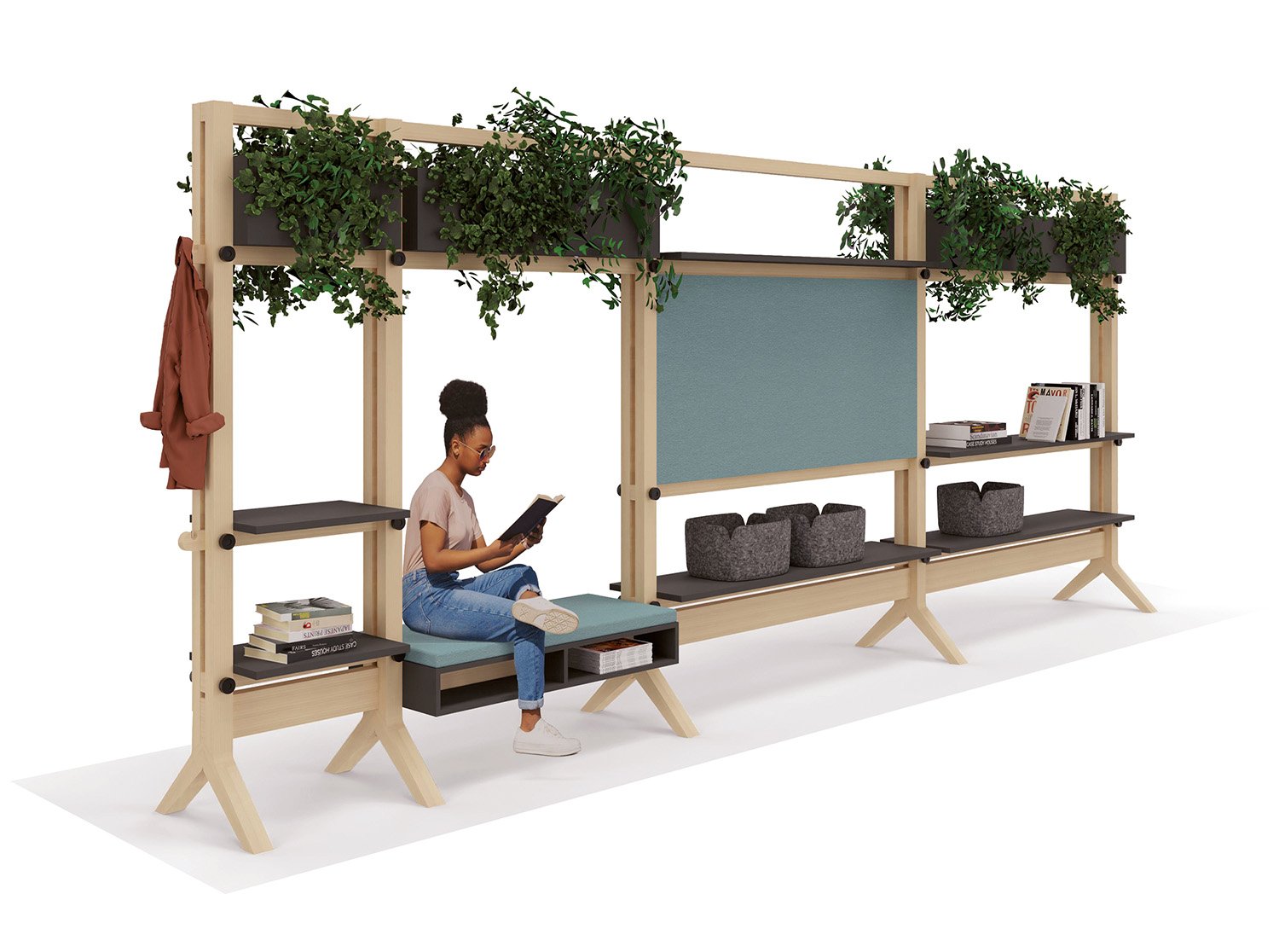 'hockey', der smarte Raumtrenner für moderne und offene Arbeitsumgebungen, besticht durch die einzigartige Verbindung aus Design, Funktionalität und Nachhaltigkeit. Die skulpturale warme Anmutung der Holzbauweise ist neben den multifunktionalen Anwendungsmöglichkeiten die Kernidee hinter dem Design des Architekturbüros 'Kinzo'.