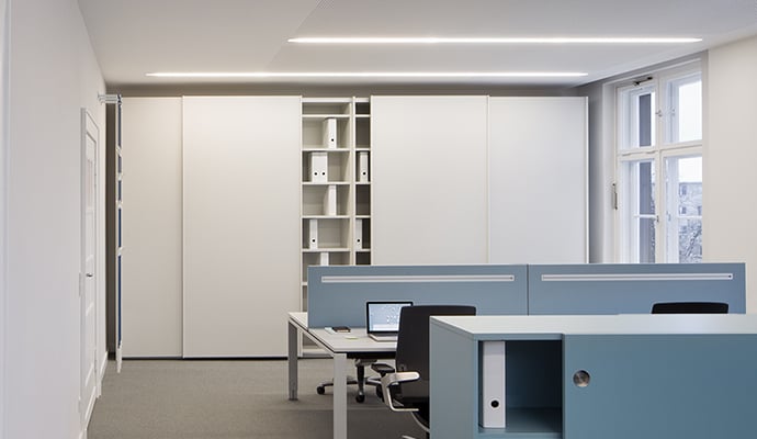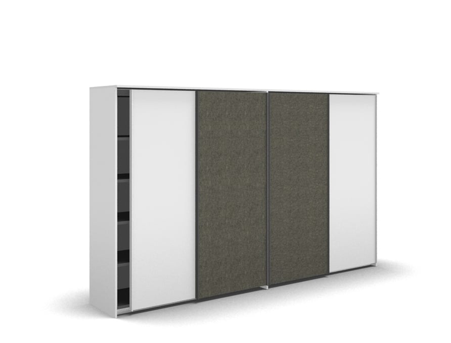 Beim Schwebetürenschrank der 'basic S' Produktlinie können Sie die Türen einfach zur Seite schieben. Der Laufweg vor dem Schrank bleibt frei und der gewünschte Gegenstand ist aus jedem Griffwinkel schnell zur Hand. Leichtgängige Laufschienen und ein integriertes Dämpfungssystem lassen die Schiebetüren nahezu lautlos zur Seite schweben. Ein flexibles Organisationsraster garantiert eine perfekte Innenorganisation. In Kombination mit großformatigen Schwebetüren erhält der Büroschrank eine ruhige, reduzierte Ausstrahlung und ordnet sich jedem Architekturkonzept unter.