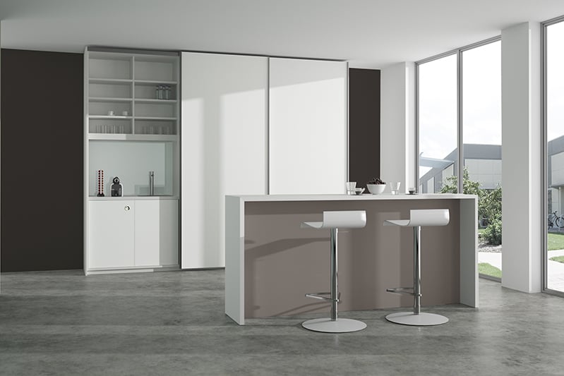 Beim Schwebetürenschrank der 'basic S' Produktlinie besteht die Parallele vom Büro zum beliebten Schwebetürenschrank aus dem Schlafzimmer ganz offensichtlich. Leichtgängige Laufschienen und ein integriertes Dämpfungssystem lassen die Schiebetüren nahezu lautlos zur Seite schweben. Eine weitere Besonderheit, der 'basic S Schwebetürenschrank' versteht sich hervorragend mit dem 'basic S Regalsystem'. Der 'basic S Schwebetürenschrank' bietet somit maximale Gestaltungsvielfalt. Größe, Material, Farbgebung und Innenausstattung lassen sich individuell konfigurieren. In Kombination mit dem Kücheneinrichtungsmodul wird der Schrank zur Pantryküche.