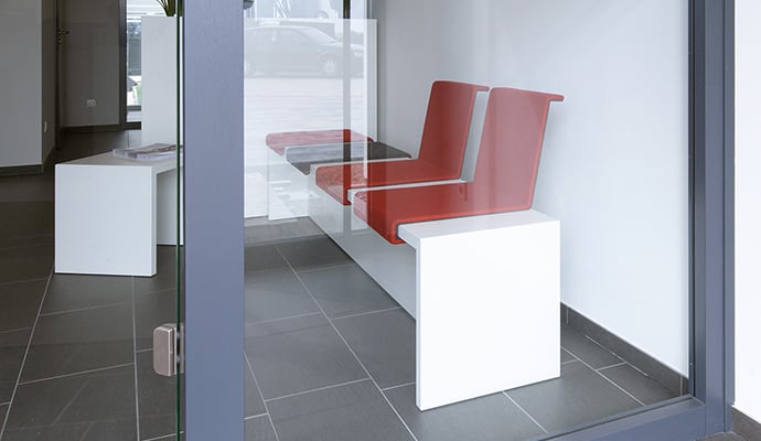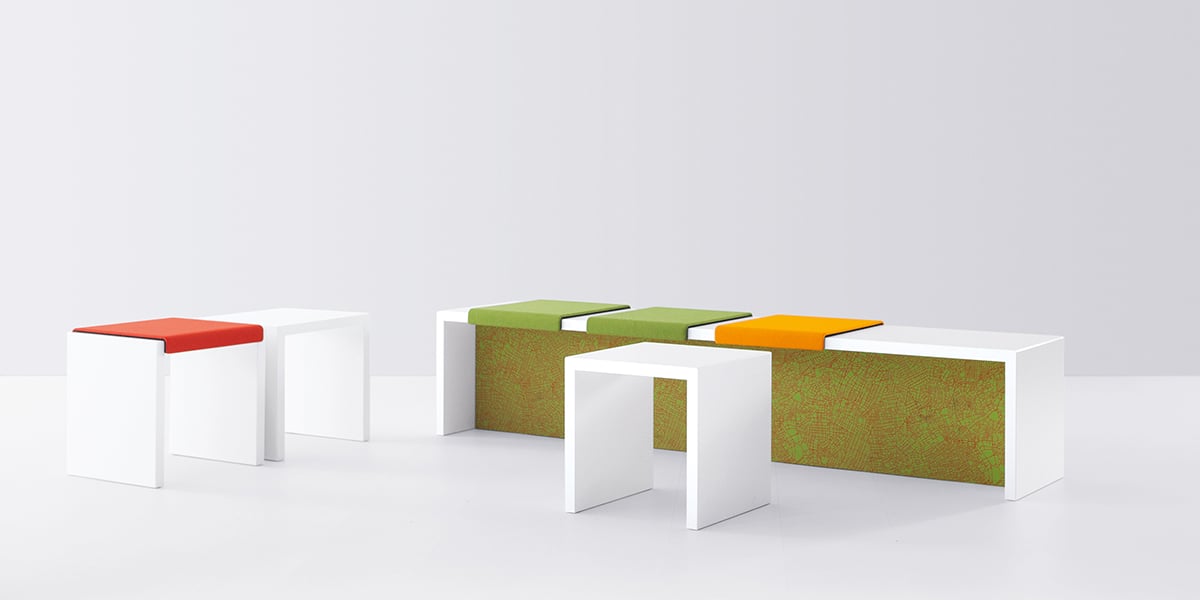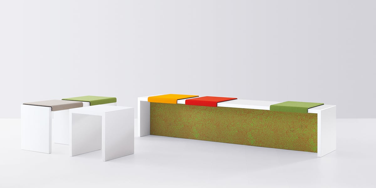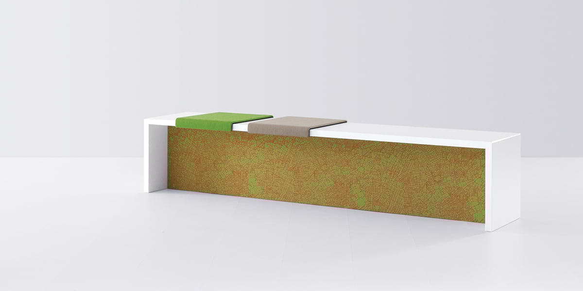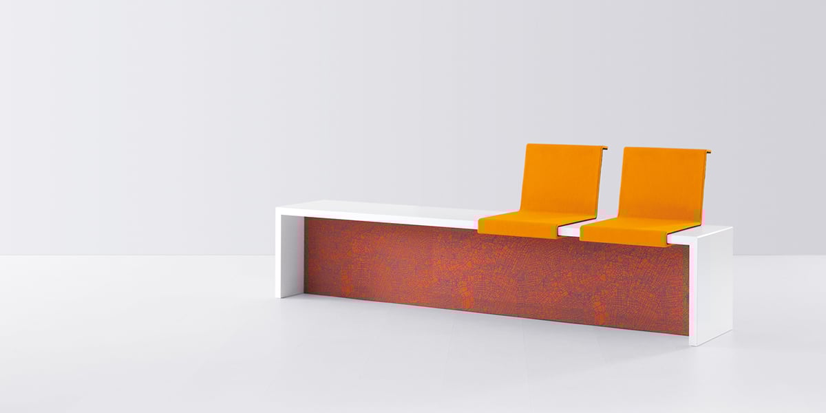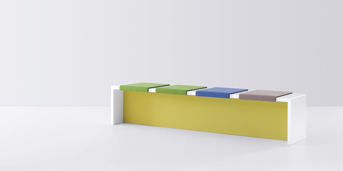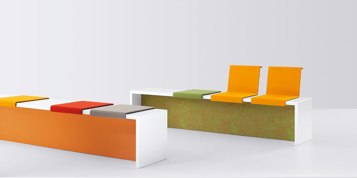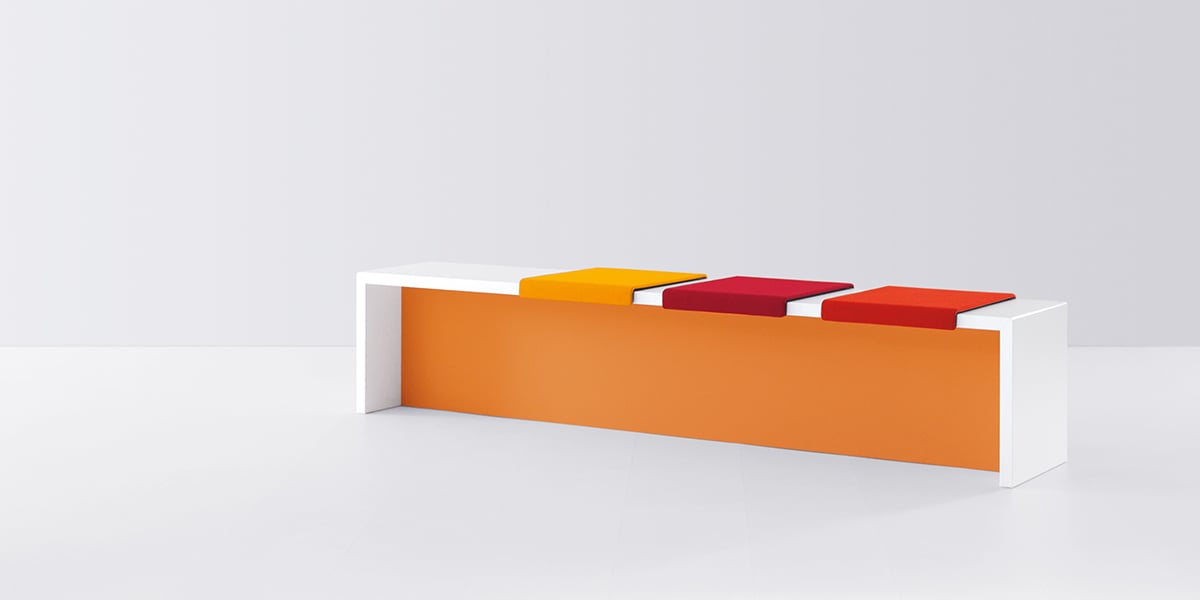 Sometimes communications are influenced by the line of sight. The seat cushions with backrest can face in one or two directions. When the backrests are next to each other, the occupants look in the same direction. If the backrests are staggered, the bench invites them to enter into a dialogue. The seat cushions are fabric-covered and, in combination with the panel, add an interesting design element.
