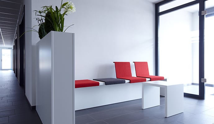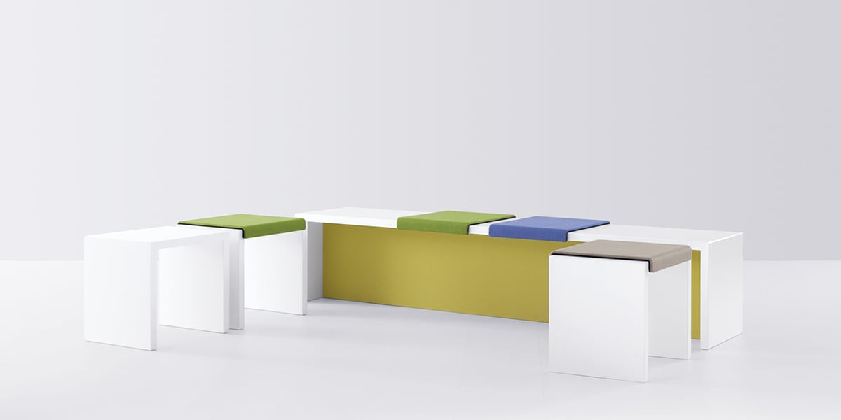 Great freedom and flexibility for successful communication. The 'K-Modul Sit' is simultaneously a bench, a table and a stool. The seat cushion, which can be positioned without the use of tools and can be changed at any time, is what defines the function. The elements stand 46 cm tall and are characterised by clear, cubic forms. Ideal for open-space offices: The 'K-Modul Sit' furniture can be regrouped for team work or short discussions whenever necessary. In combination with our 'basic C' and 'cockpit 2.0' reception desks, welcoming waiting and reception areas can be created where visitors, staff and business associates all feel comfortable.