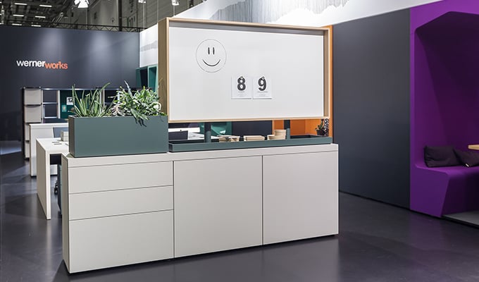 Sideboards are often used in open-plan offices to define work areas. The 'Kinzo' design office has developed add-on units on behalf of werner works especially for this type of use. The units not only give structure to the room but are also acoustically effective. With dimensions matched to our standard cupboards 'basic S' and 'basic cap' , the add-on units are set on top of two-file-high cupboards without the use of tools. The necessary stability is ensured by the mitred construction of the frame and by a weight integrated in the lower tray. This means that the add-on units can also be added to existing office structures at a later date.