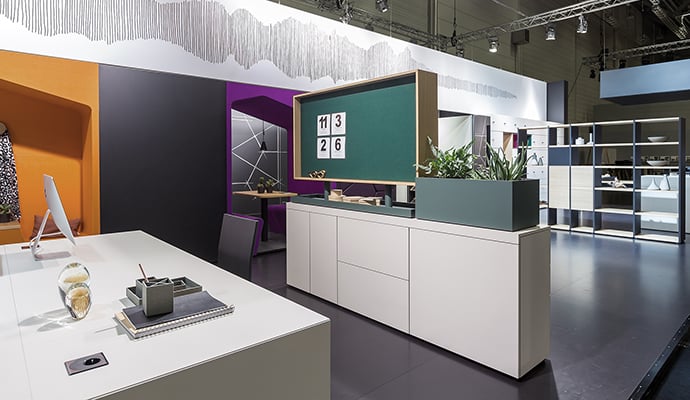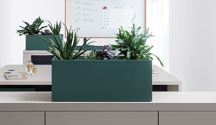 The frame construction of the pinboard has mitred joints and is available in a melamine decor or in a real wood veneer or paint. The sandwich-constructed pinboard panel is covered on both sides with fabric and can optionally be furnished with an acoustically effective material. By using a write-on and magnetic whiteboard surface, the pinboard offers an action area for project work directly at the workplace. The lower tray of the pinboard not only serves as a stabiliser, but also holds office accessories and can be painted in all RAL and NCS colours. The planter comes with a waterproof inner and is painted as standard.