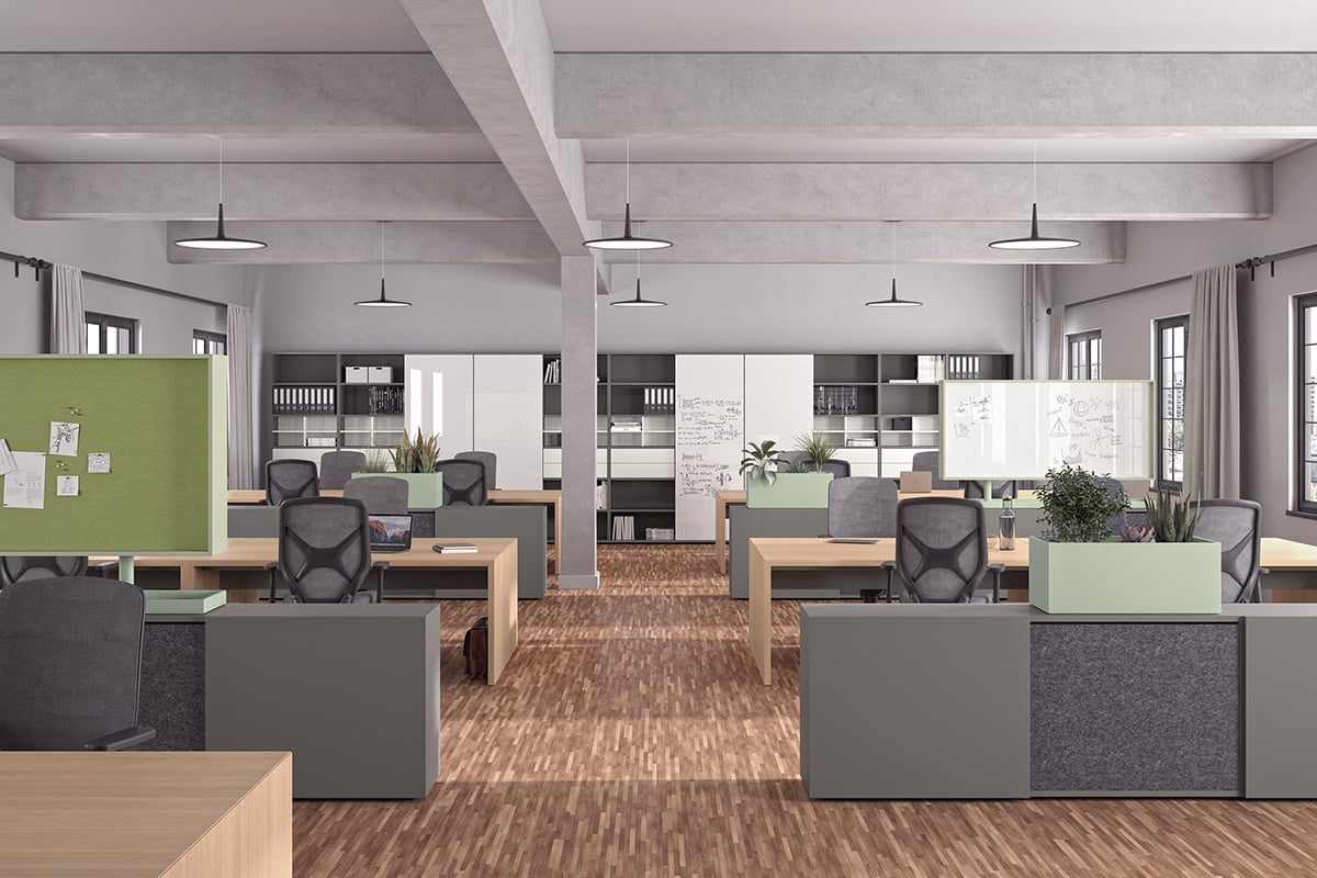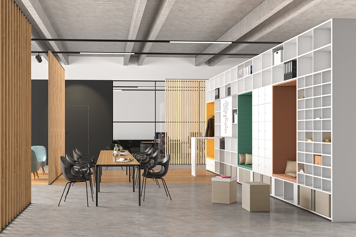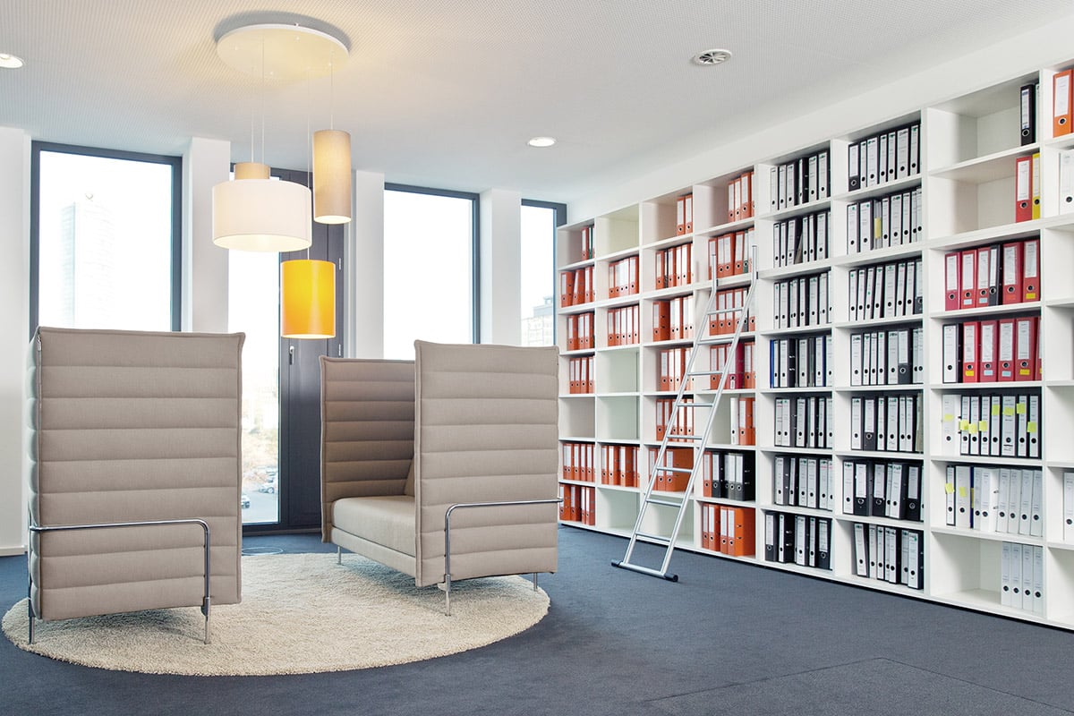Open office concepts mean togetherness. People are next to each other, with each other and for each other across a large area. Shelving systems from 'werner works' give structure to open-space concepts and allow central information and meeting areas to be established. For example: a central library in an open-space office.