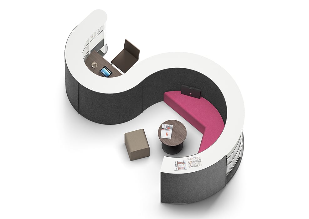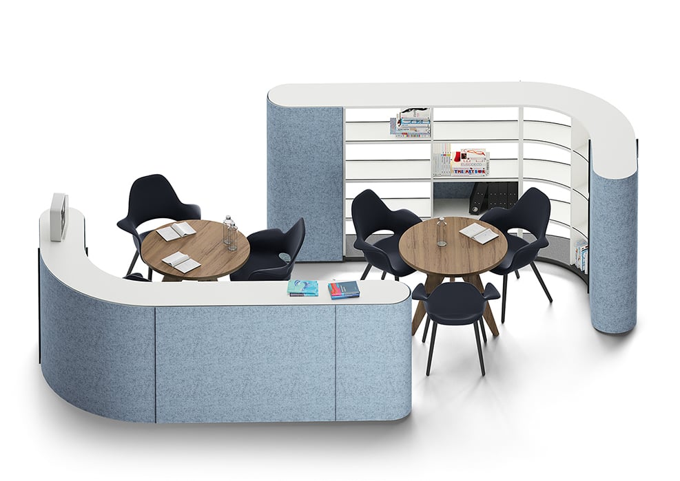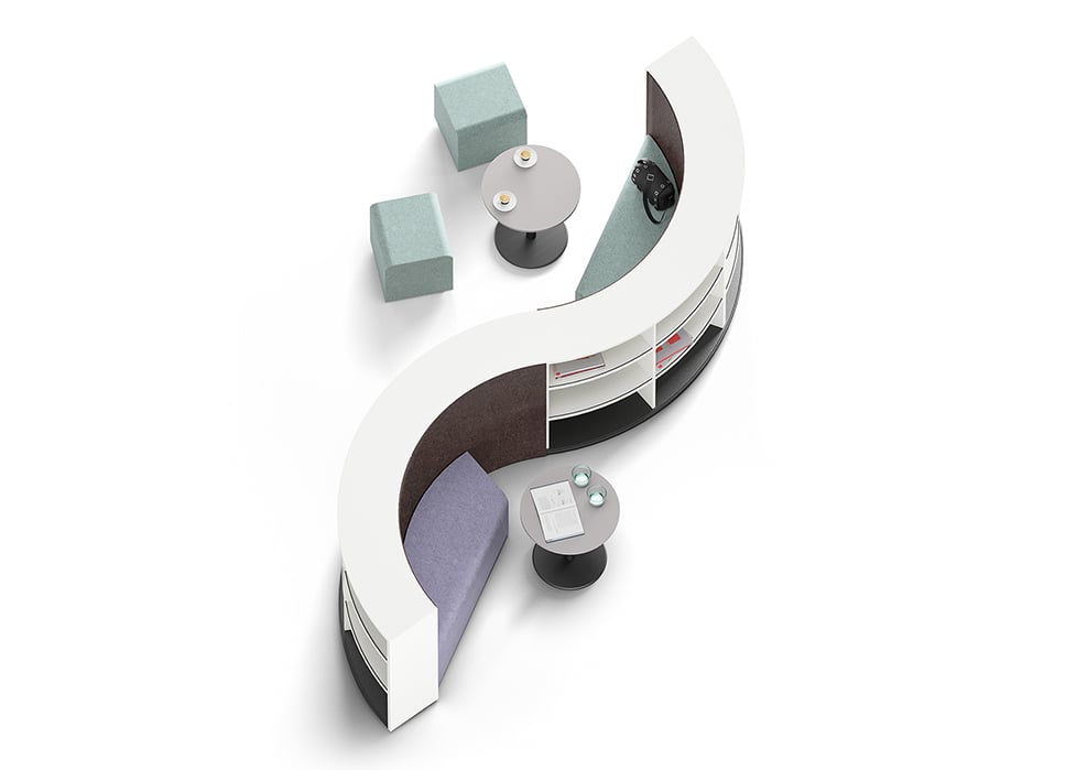 The office shelf as an essential component of the overall architectural concept – this is the idea of 'basic flow'. Straight and curved shelving elements can be combined in a variety of ways and various materials and colours open up versatile design possibilities. The shelving system centres on the unique slider blinds: acoustically effective sliding fronts made of felt material, which can be moved across several elements. This results in an attractive interplay between closed and transparent areas.