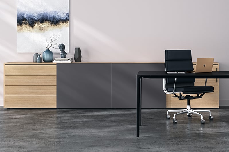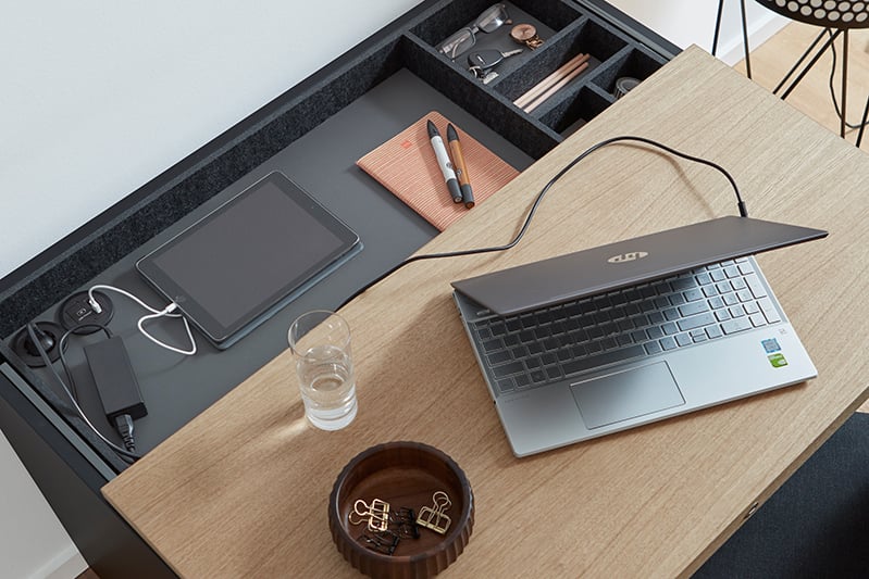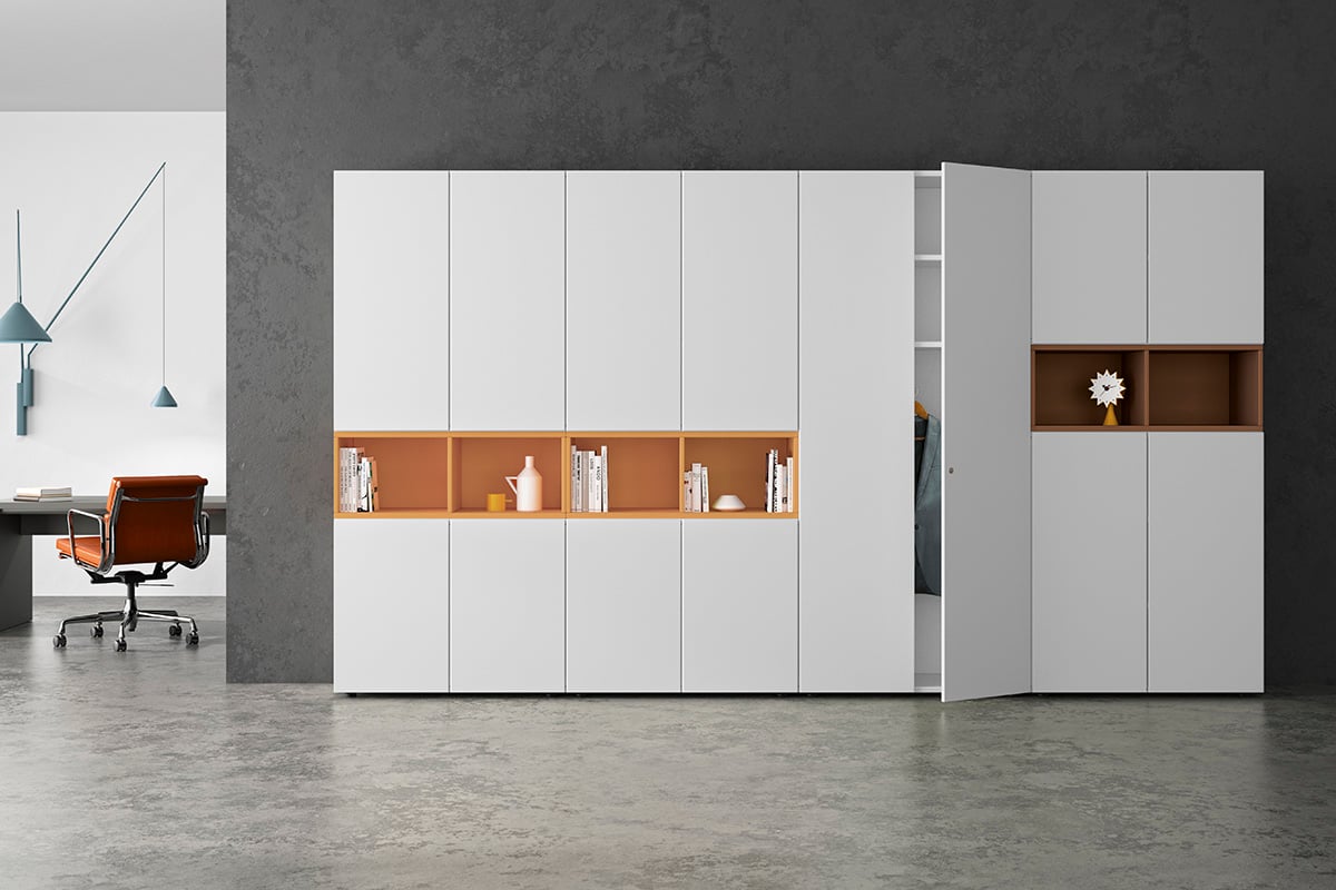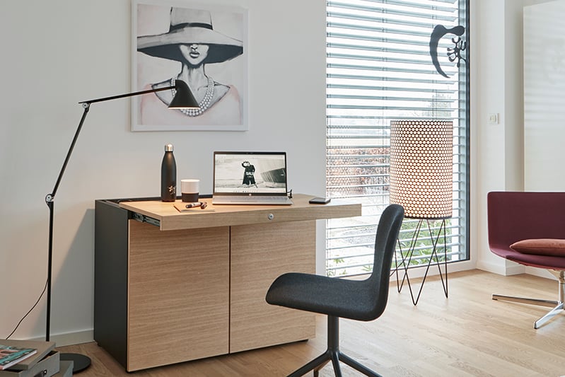 'basic cap Home' combines storage space and workplace in a single piece of furniture. The minimalist design of the basic cap storage range in combination with the pull-out top panel as a worktop offers a comfortable place to work without sacrificing aesthetics.
