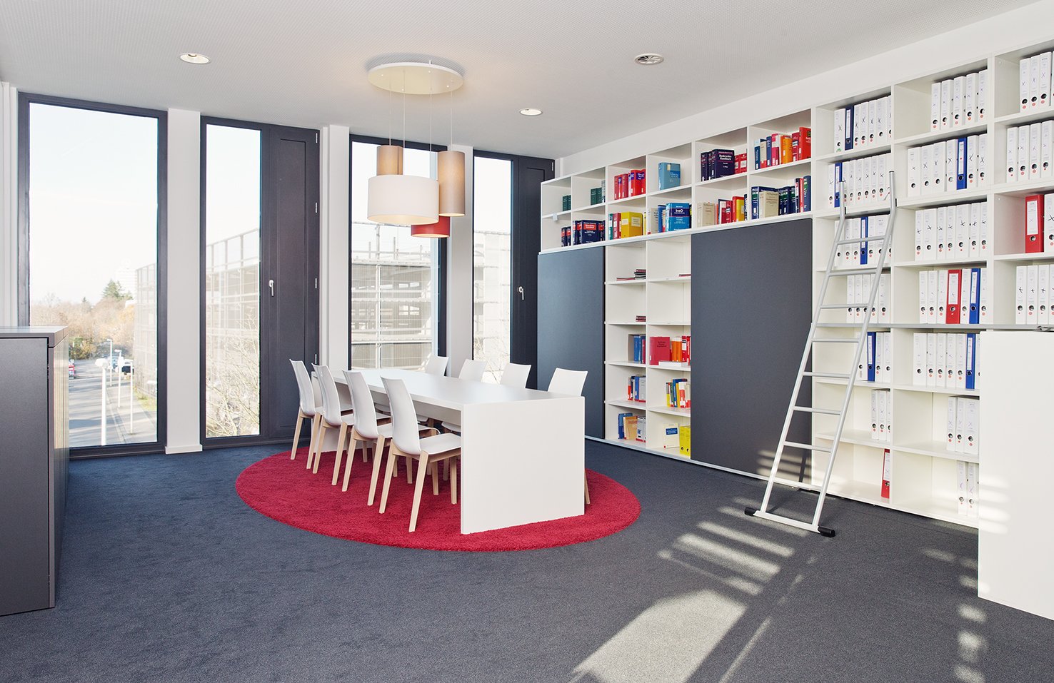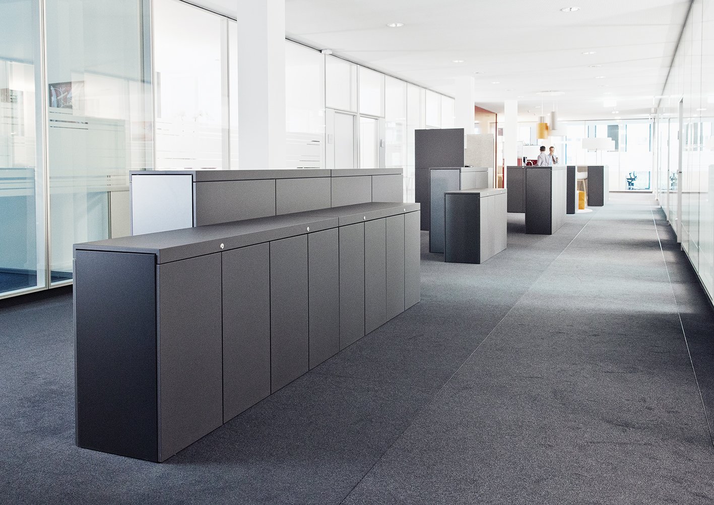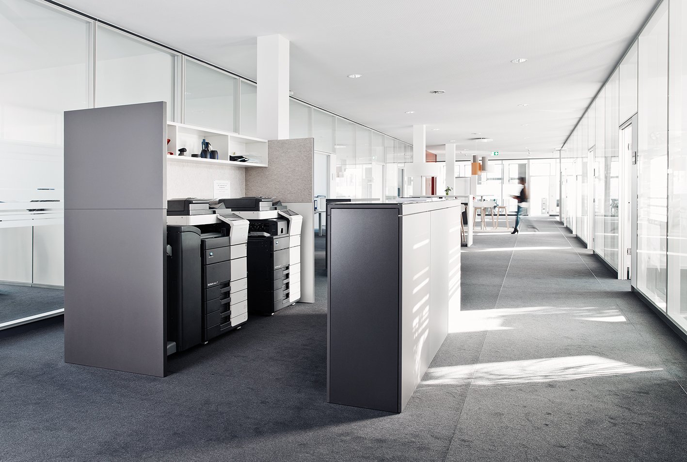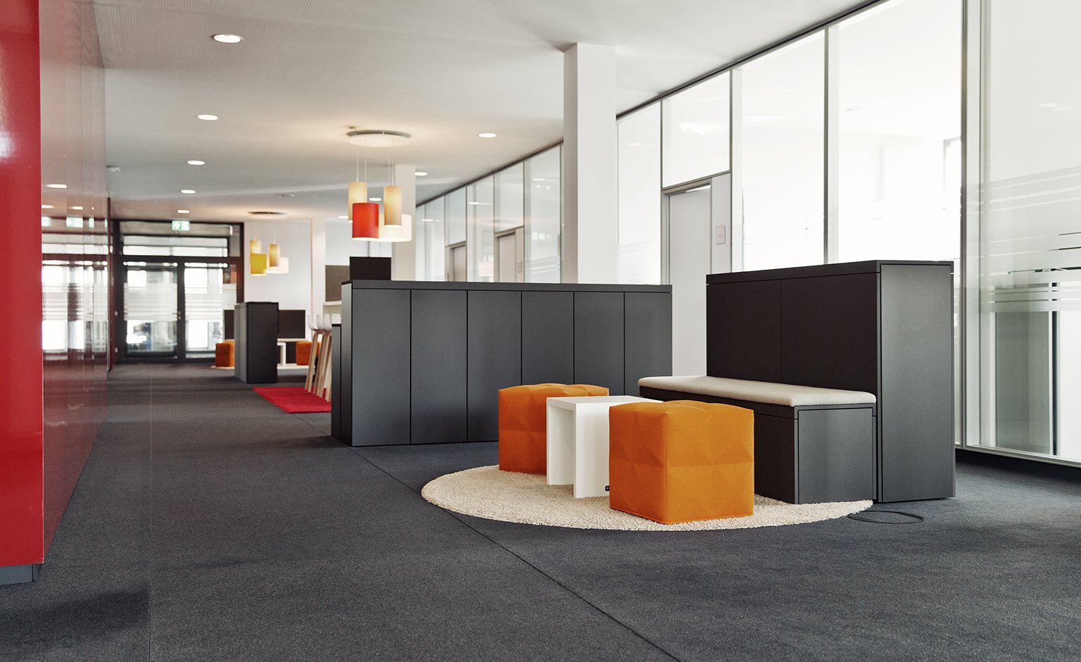 The interior designers solved the storage space problem with the modular basic cap cupboard system: Like different blocks in the classic computer game Tetris, the anthracite-coloured elements of different heights slot into various positions on the also anthracite-coloured carpet. With coloured communication islands and free-standing tea kitchens to liven up the design, a vibrant and diverting central zone landscape was created.