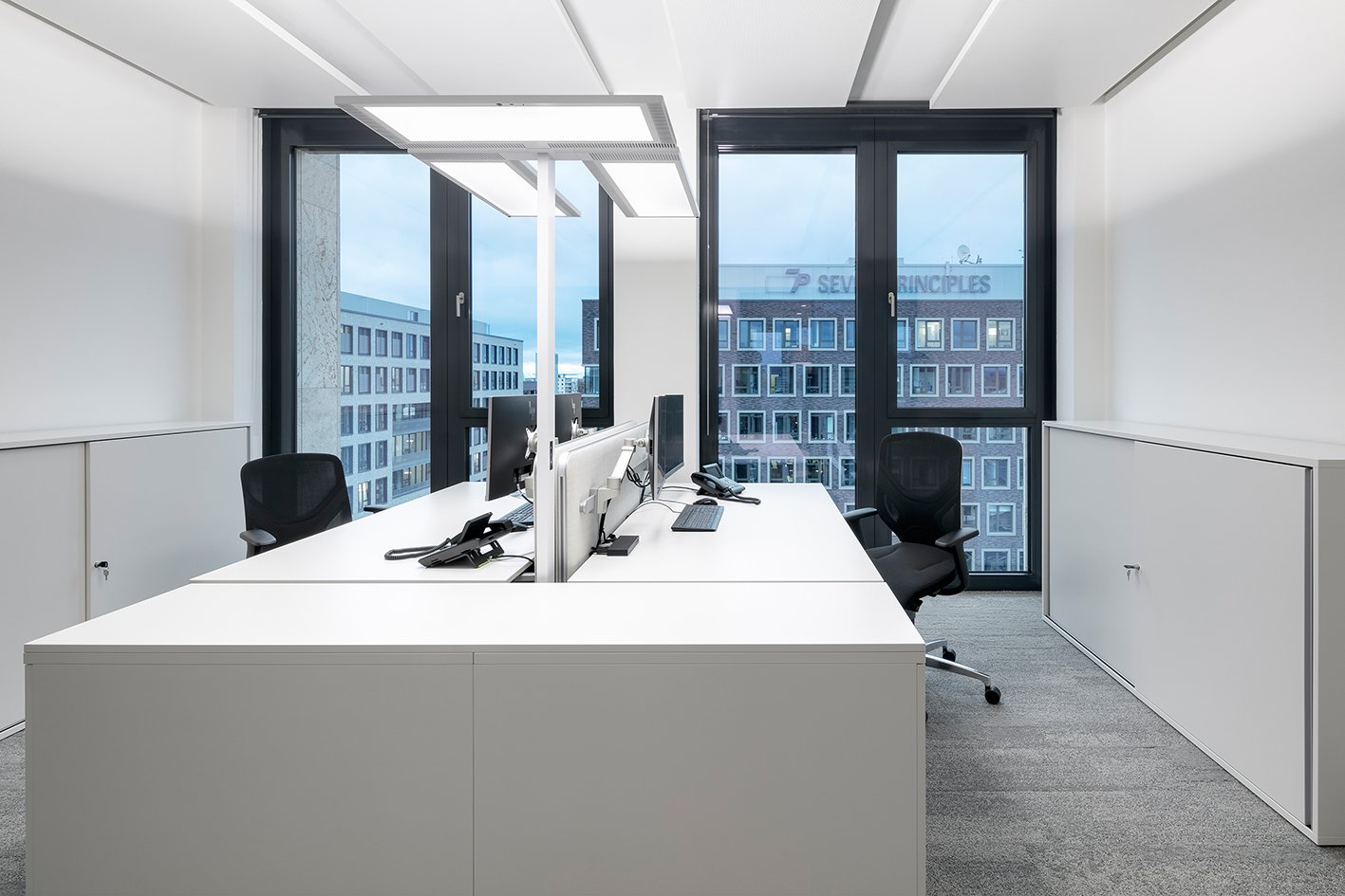 The overall concept of the interior design was developed by Pell Architekten from Cologne. The concept features clearly structured workplaces along the façade, ranging from individual offices to open spaces, every form has been incorporated to facilitate the work of the various departments. Team zones offer a further opportunity for communicative work. The flexible working options are rounded off by networking areas and meeting rooms. Basic colours have been kept neutral, each floor is additionally designed with an accent colour, which is mirrored in the furniture and paintwork.