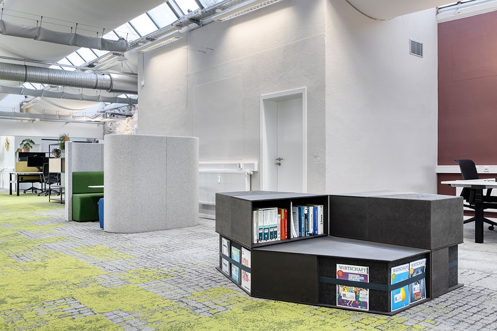 Our 'stepup' elements are used in various functions both in the work area and in the common area. Seating and storage space for reading in the open space. A shaped grandstand as flexible seating for presentations and events of all kinds in the work café.