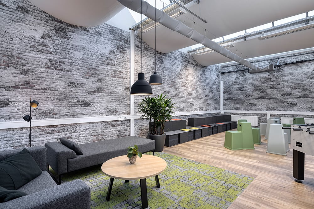 feco interior designer Stefanie Ranko developed an inspiring interplay of different zones. A carpet with a cobblestone look and a green moss path not only supports the industrial charm of the building, but at the same time ensures the division of the work area in the open space, which is to be used as a place for productivity and concentration.