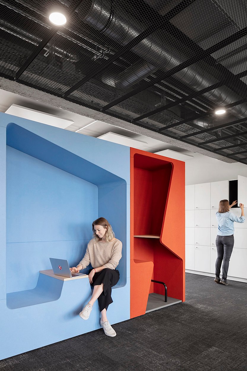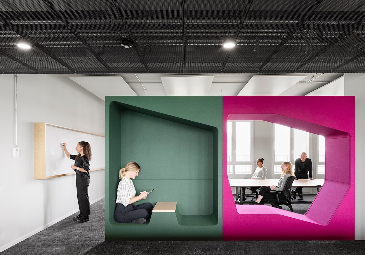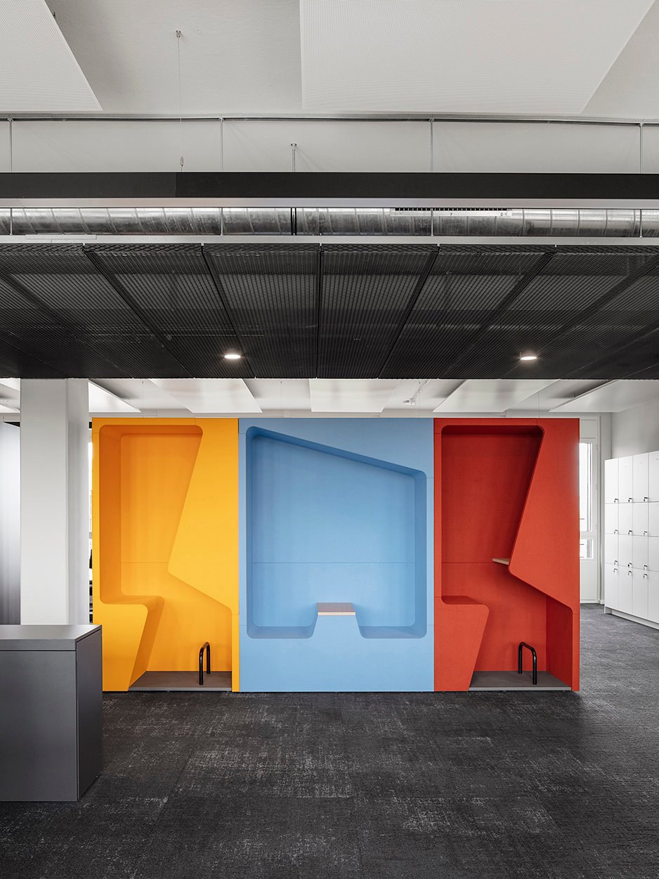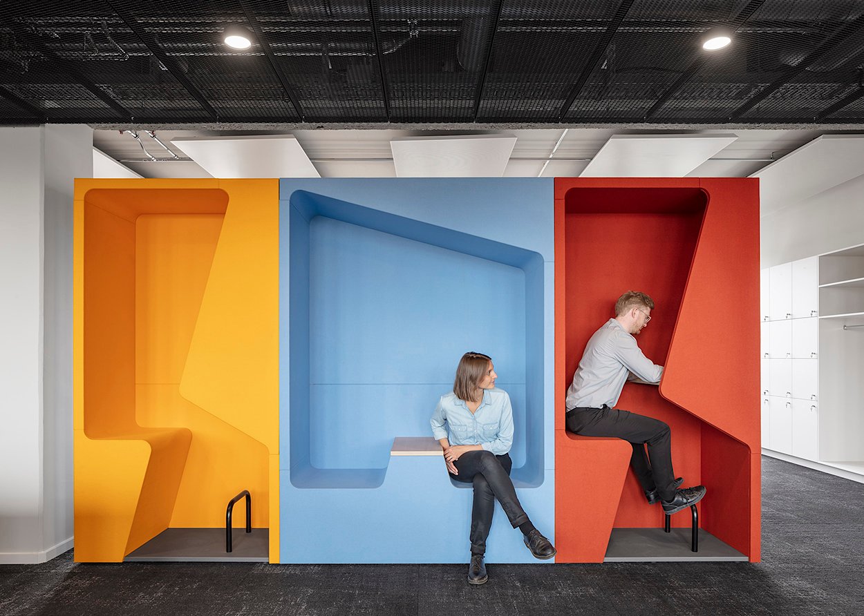 Colourful and vibrant, the 'parkour' cupboard booths are adding interesting focal points to this modern working environment, provide breakout spaces and lend structure to the open office layout. werner works 'basic cap' sideboards have been effectively used to create zones around individual work spaces and provide extra storage space.