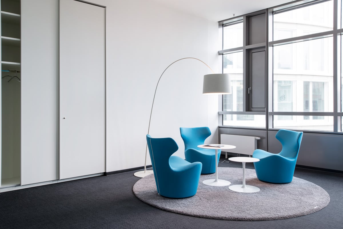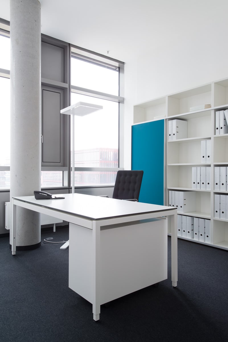 From the office furniture and storage space planning through to the design of the conference rooms and reception area – everything came from a single source. A new, modern colour concept in turquoise and white runs through almost all of the rooms. Straight lines and clear forms dominate, but curved elements also found a place.