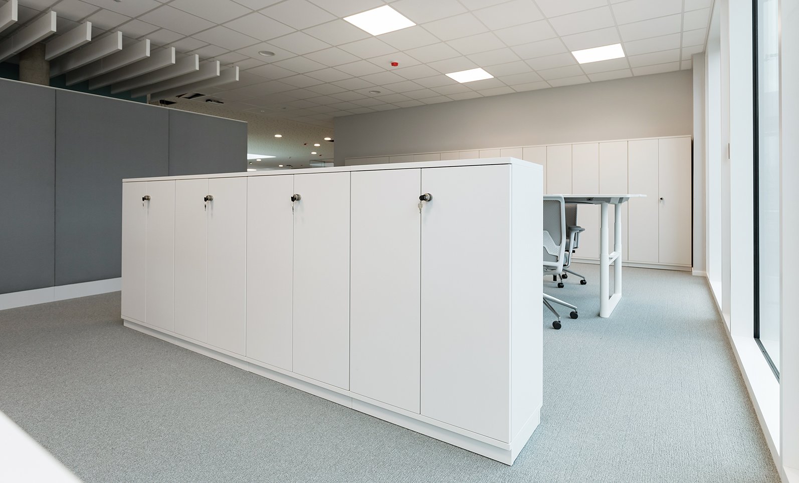 Hinged-door cupboards from the basic S range are used to divide the multi-occupancy offices into individual workstations. The taller version, as a wall cupboard, offers storage space for the central repository.