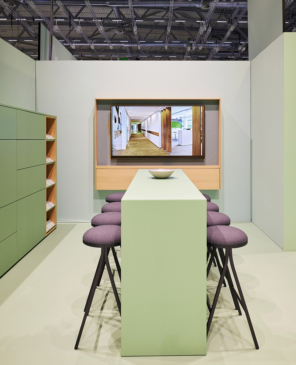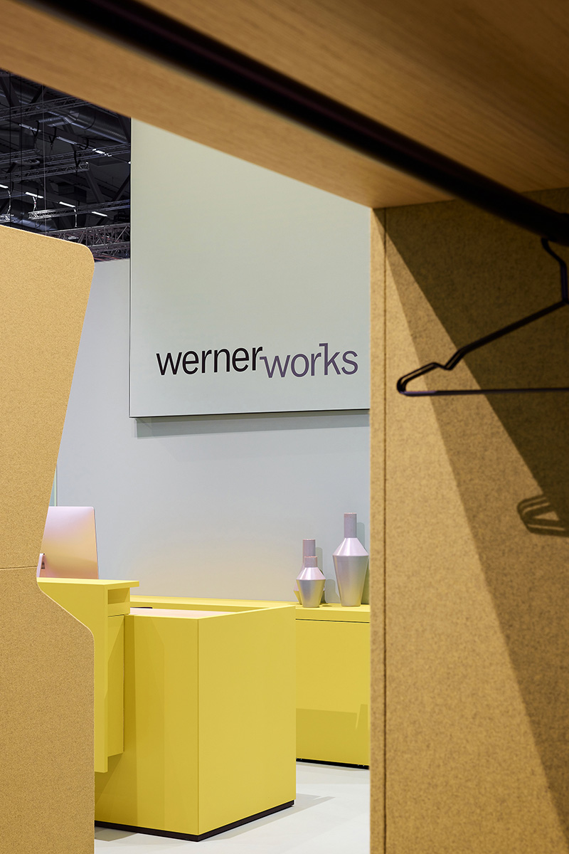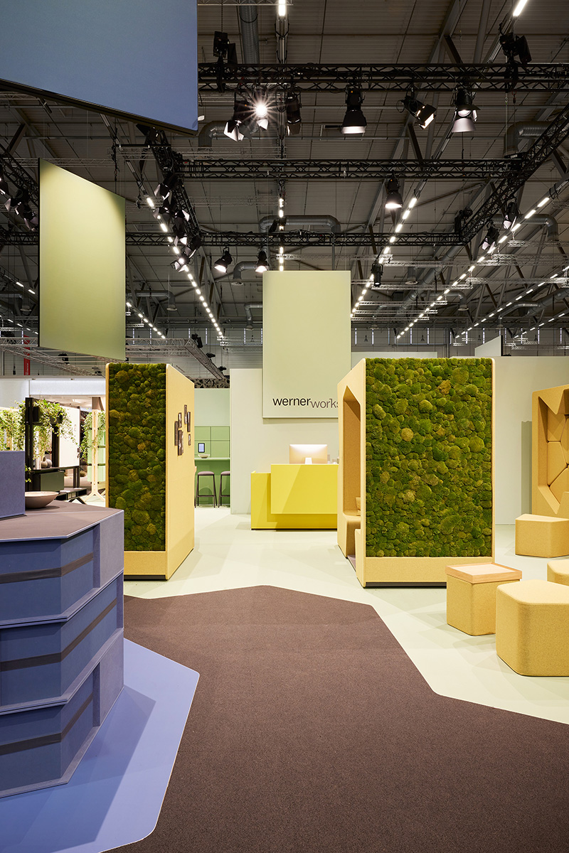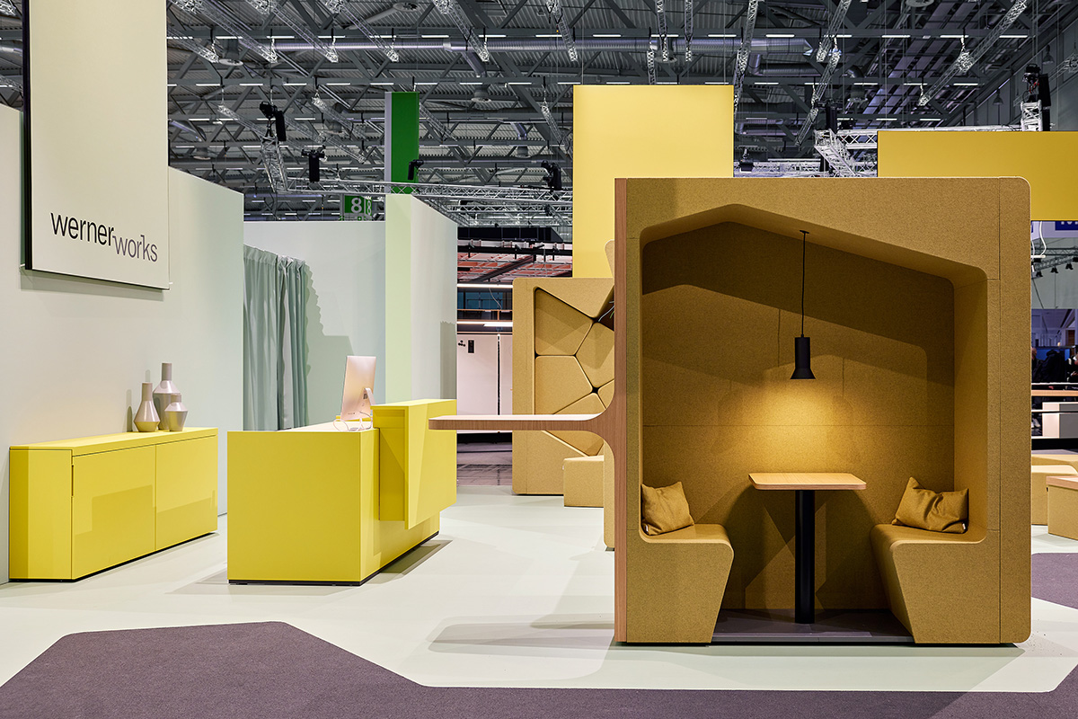 Adopting the theme: “Designing Tomorrow’s Office Landscapes”, architectural company Kinzo has developed a concept for werner works, drawing inspiration from natural landscapes. The booth space is primarily defined by the products themselves, highlighting the furniture’s capacity to shape and transform environments. The furniture and bold colour scheme combine to create abstract topographies, while the floating air frames add a vertical dimension to the space.