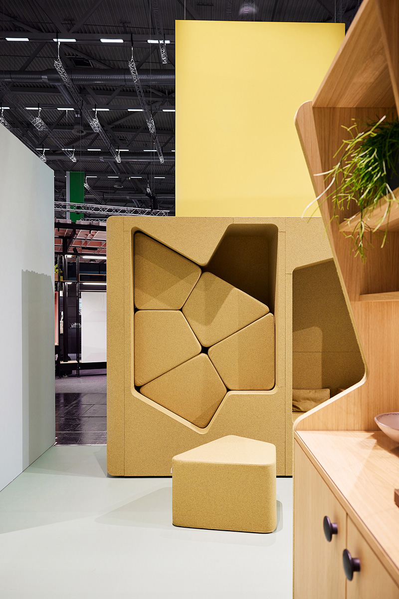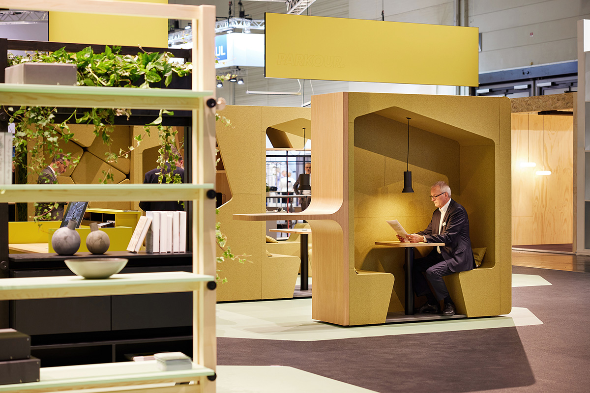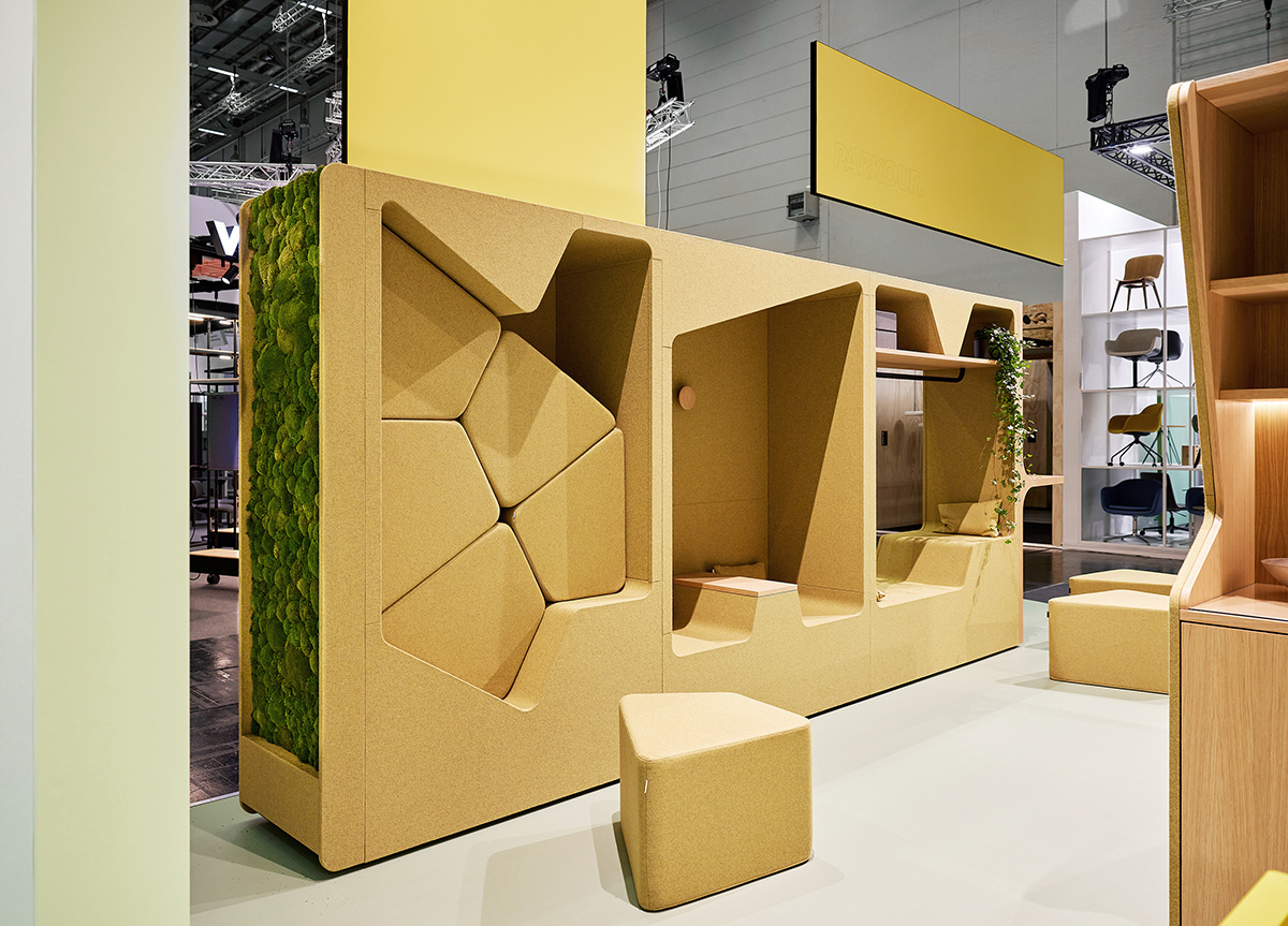 Adopting the theme: “Designing Tomorrow’s Office Landscapes”, architectural company Kinzo has developed a concept for werner works, drawing inspiration from natural landscapes. The booth space is primarily defined by the products themselves, highlighting the furniture’s capacity to shape and transform environments. The furniture and bold colour scheme combine to create abstract topographies, while the floating air frames add a vertical dimension to the space.