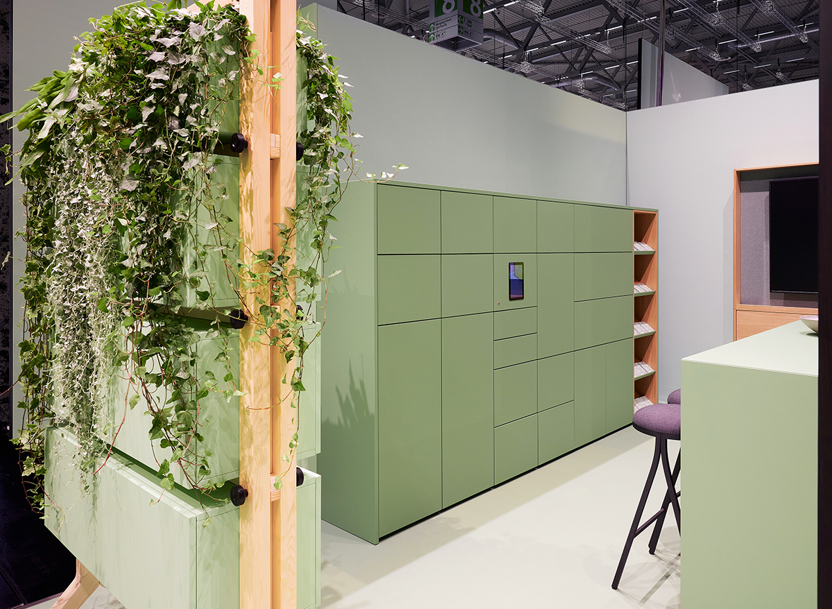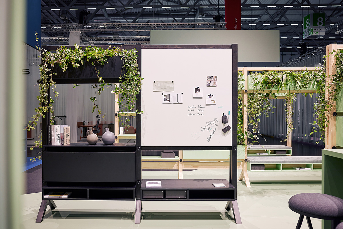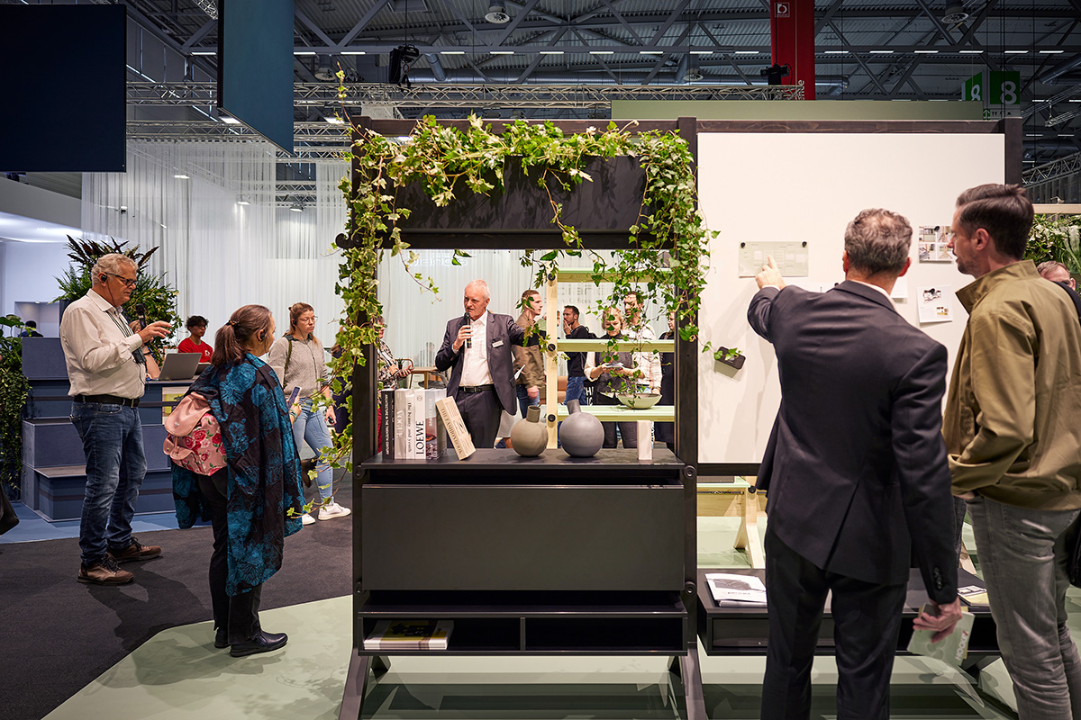 Natural elements such as plants are integrated into the furniture throughout the booth, creating a warm, natural atmosphere. The overall effect is as if the space is growing organically out of the ground – a striking visual spectacle in the exhibition hall.