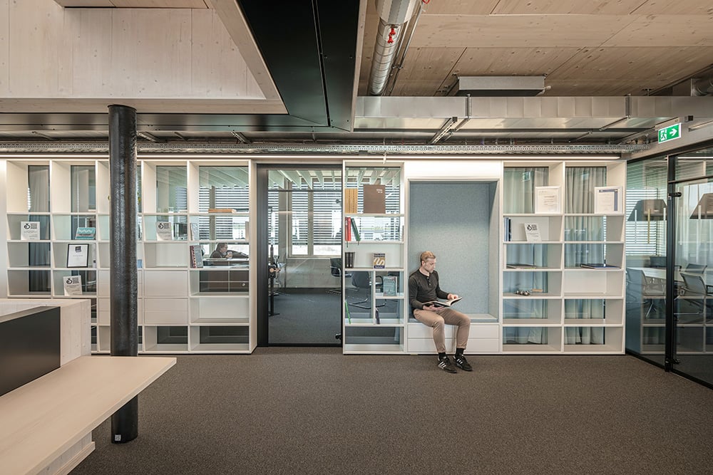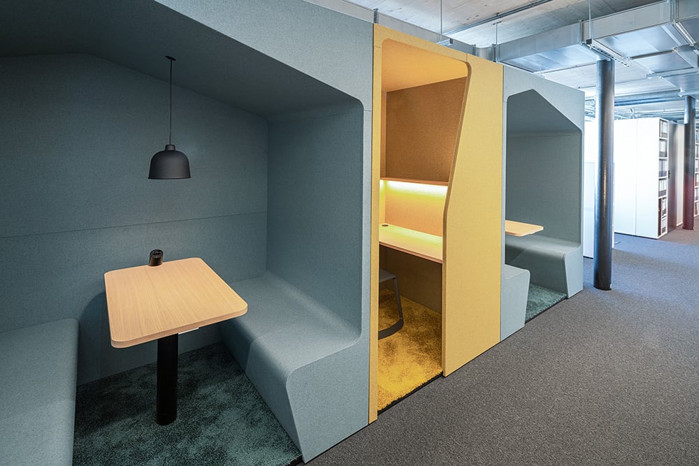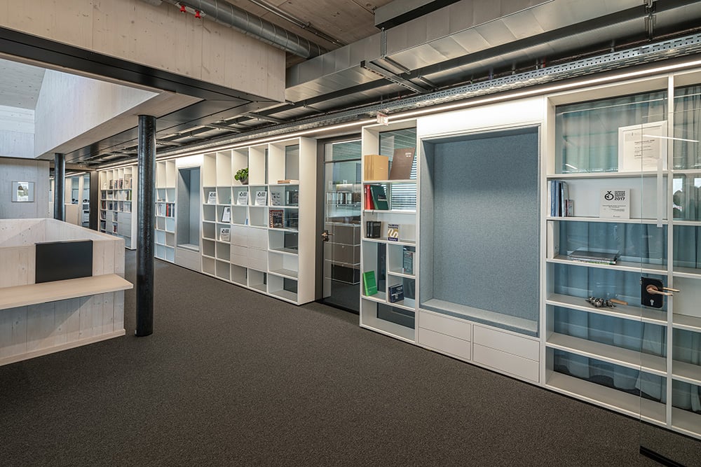 Auch das Innenleben des neuen Hauptsitzes ist State-of-the Art, denn BAURCONSULT hat sich von kleinen Einzelbüros verabschiedet und stattdessen ein modernes „Multispace-Office“ geschaffen. Es existieren unterschiedliche Flächen für die Mitarbeiter, so dass es möglich ist, zwischen konzentriertem Arbeiten in Ruhe und dem Austausch mit Kollegen zu wechseln. Hierbei fügen sich unsere 'parkour' Kojen zum Rückzug aber auch zur Zusammenkunft in die betreffenden Zonen ein. Die 'basic S Regalwände' strukturieren zum einen den Raum, bieten Platz für Stauraum und sind auch optisch eine gelungene Ergänzung.