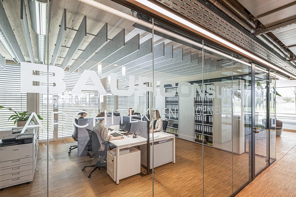 Ein Bürogebäude welches Nachhaltigkeit und modernes Büroambiente vereint: Die neue Firmenzentrale des Architektur + Ingenieur Büros BAURCONSULT bei Haßfurt. Das selbst ernannte "Zuhause" für seine Kunden und Mitarbeiter bietet genau das, was man sich von einer modernen Bürowelt wünschen kann. Der Bau ist eine schlichte Schönheit mit zeitlosem sowie hochwertigem Design. Sowohl außen als auch innen kommt Holz zum Einsatz, welches den Wohlfühlfaktor deutlich steigert. Das BAURCONSULT-Gebäude ist mit einem Holzanteil von 80 Prozent ein echter Klimaschützer, denn im Vergleich zu herkömmlichen Baustoffen spart Holzbau in diesem Fall mindestens 660 Tonnen CO2 ein.