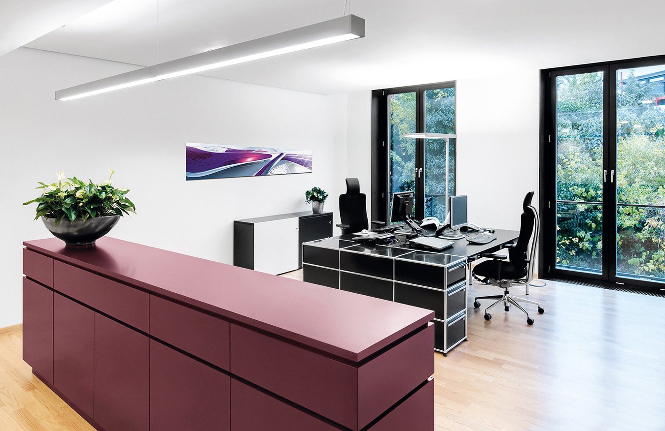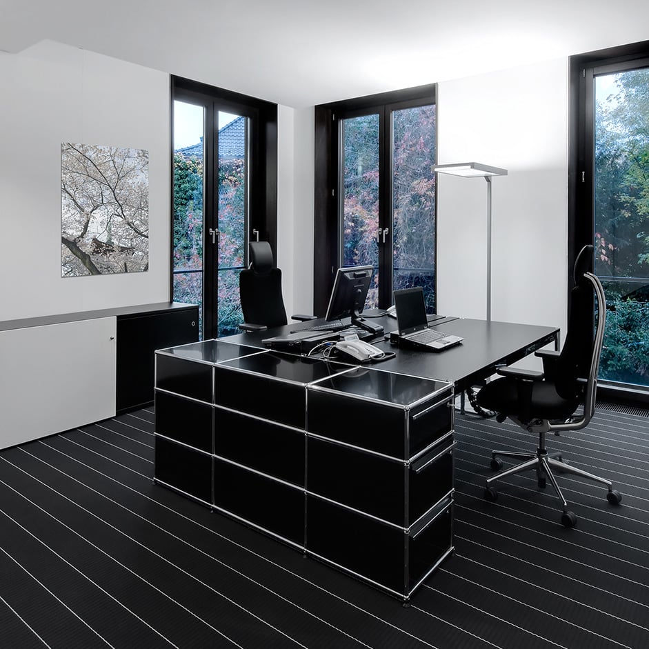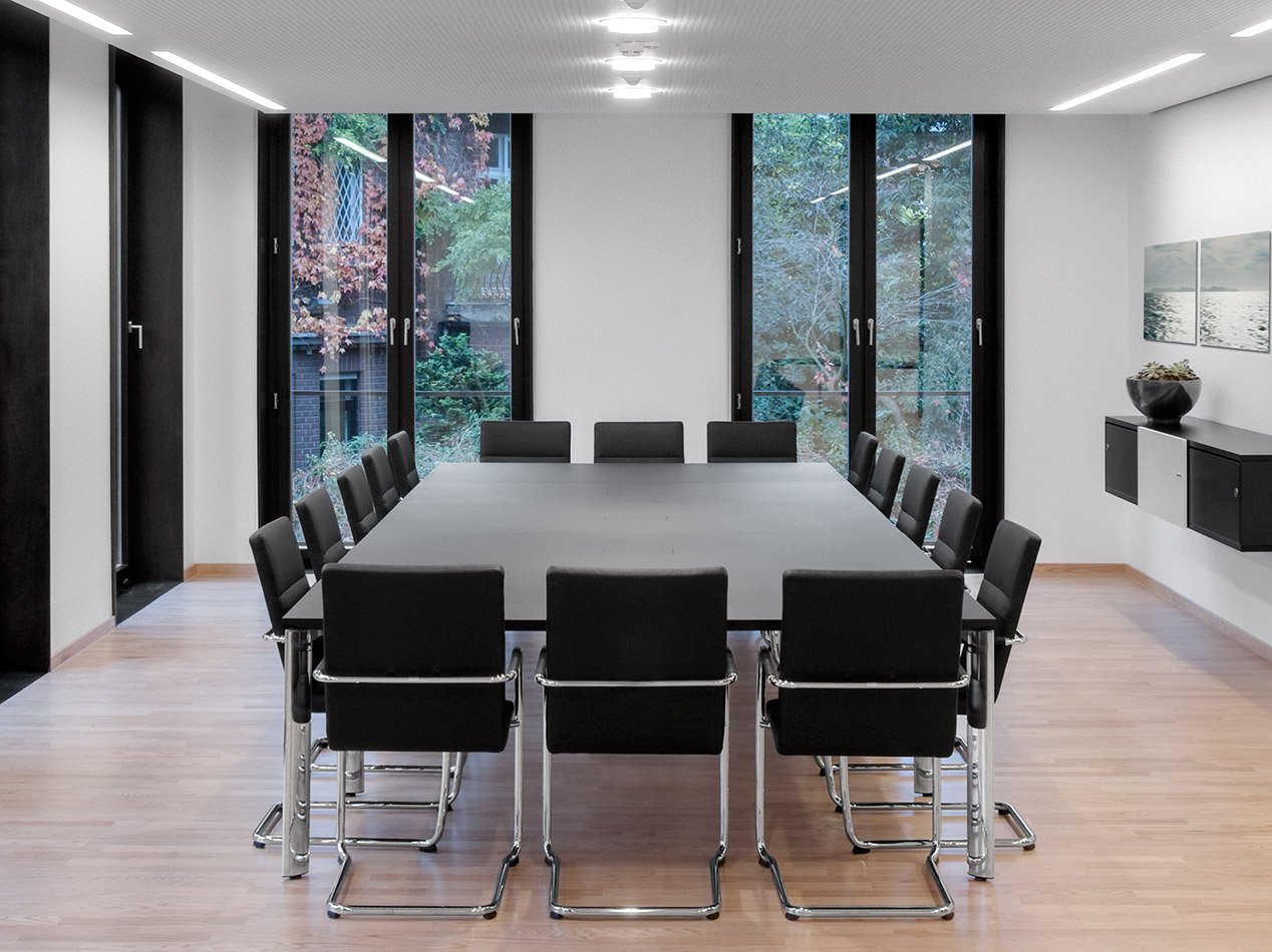 Am Standort Düsseldorf hat sich die BayernLB für Mobiliar von USM in Verbindung mit werner works Schränken entschieden. Raumhohe Schwebetürschränke der Produktlinie basic S, passgenau auf die Raumsituation zugeschnitten, bieten den Mitarbeitern großzügigen Platz für den zentral benötigten Stauraum. Für die persönliche Ablage im direkten Zugriff wurden basic S Sideboards im Rücken der Mitarbeiter vorgesehen. In den Konferenzräumen tragen die wandhängenden Lowboards zur Gestaltung des Raumes bei und bieten zugleich Abstellfläche für das notwendige Equipment zur Bewirtung der Gäste.