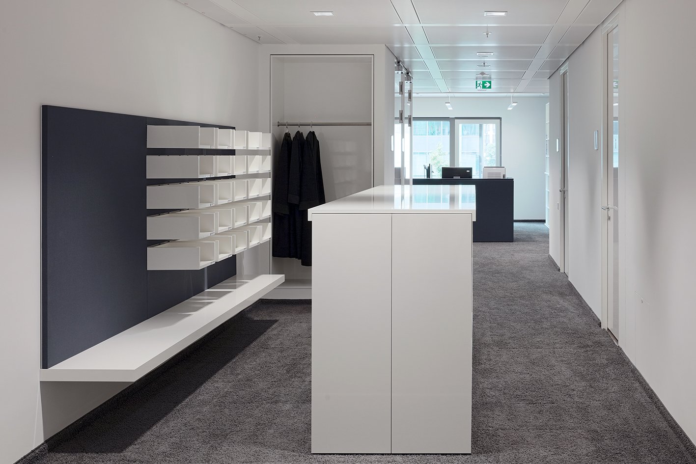 Die z.B. durch den Einsatz von weiß geölten Eichendielen und Strichrastergrafiken hochwertig ausgestatteten Mitarbeiterlounges von hoher Qualität schaffen ein ebenso konzentriertes wie angenehmes Arbeitsumfeld.