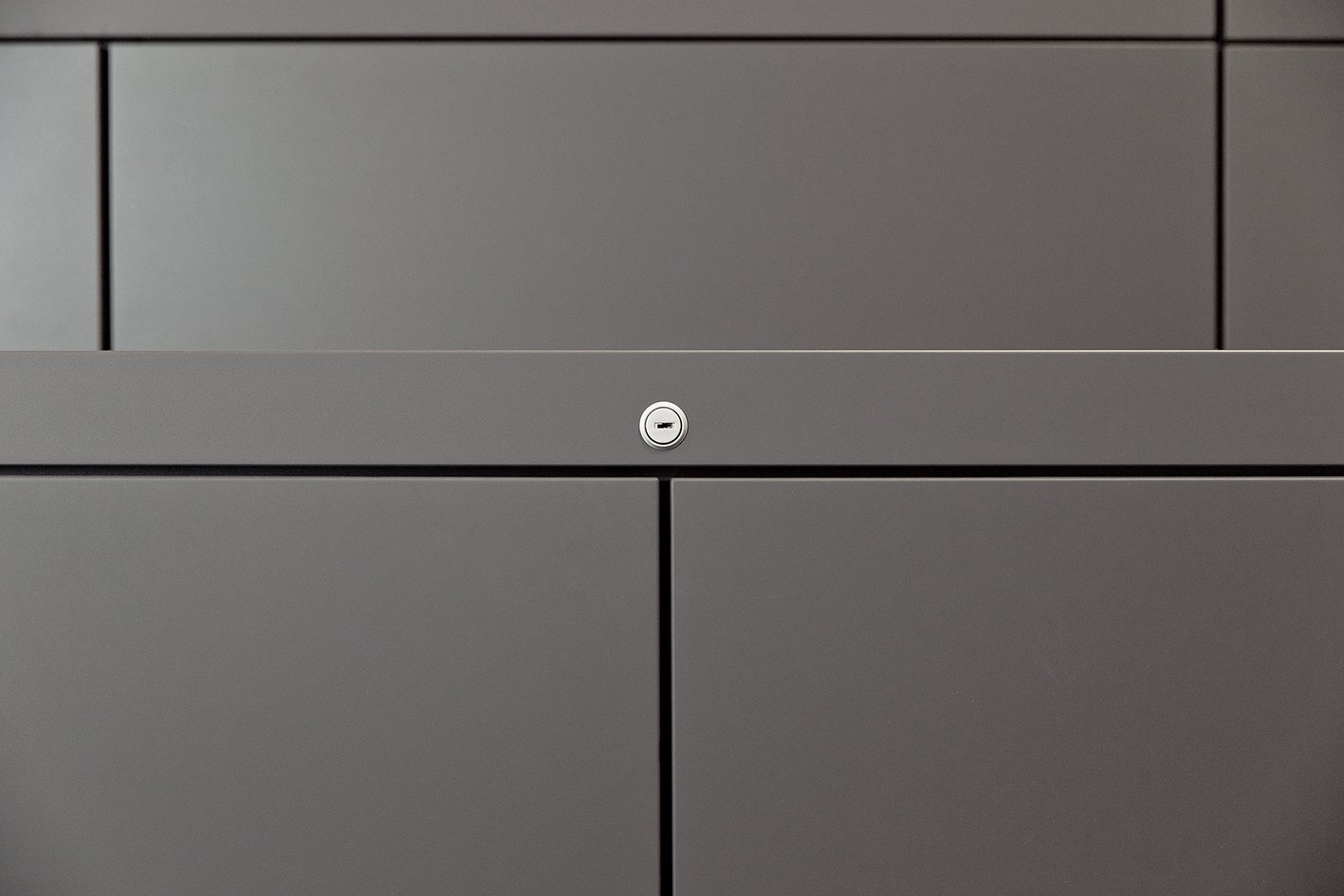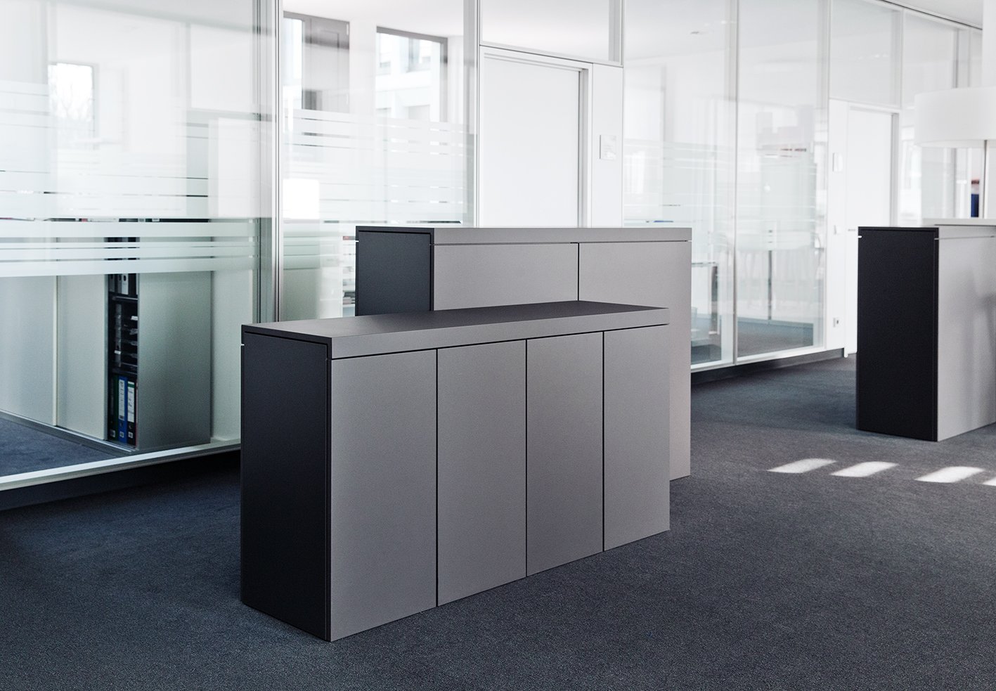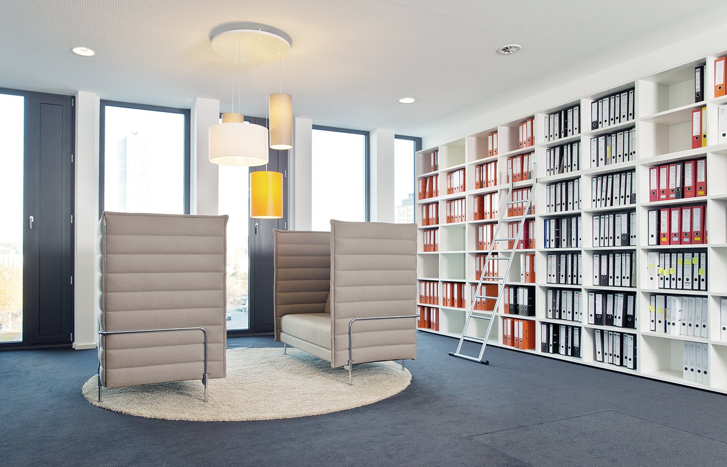 Die Innenarchitekten lösten das Stauraum-Problem mit dem modularen Schranksystem basic cap: Wie verschiedene Steine im Computerspiel-Klassiker Tetris reihen sich anthrazitfarbene Elemente unterschiedlicher Höhe und Lage versetzt auf dem ebenfalls anthrazitfarbenen Teppichboden aneinander. Aufgelockert mit farbigen Kommunikationsinseln und frei stehenden Teeküchen entstand so eine lebendige und kurzweilige Mittelzonen-Landschaft.