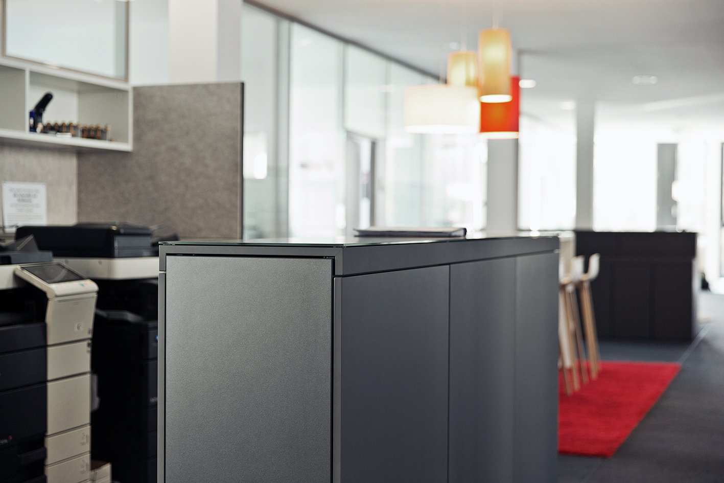 In Anlehnung an basic cap und die geradlinige Architektur des DHPG-Hauses entwarfen die Gestalter die individuellen Teeküchen, Druckerzonen und Kommunikationselemente – diese runden das Gesamtkonzept perfekt ab.