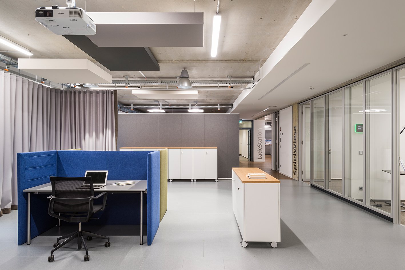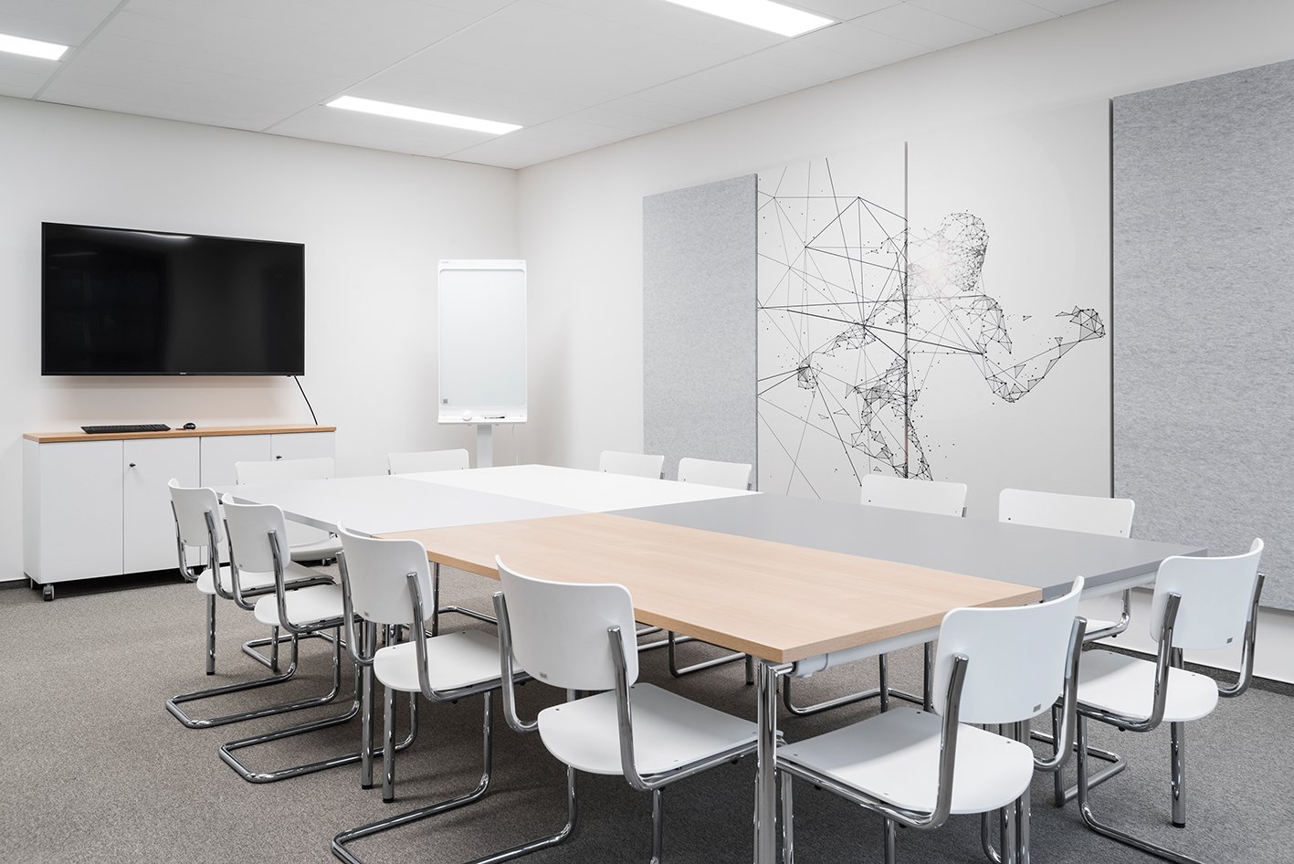 Zu den Neuerungen zählen unter anderem das Öffnen der Räume, die Ausstattung mit Lärmschutzpaneelen unter den Decken sowie die Möglichkeit zur Separierung durch Vorhänge und die Ausstattung einer geräumigen Lounge, in der man auf eine ungezwungene Art und Weise zusammentreffen kann. Um diesen Aspekt zu verstärken, wurde in mehrfacher Hinsicht auf einen Mix gesetzt. Das gilt sowohl für die Farben von Grau bis zu Blau, Grün und Orange, für die Materialien wie Holz, Kunststoff und Metall sowie die große Produktpalette unterschiedlicher Möbel.