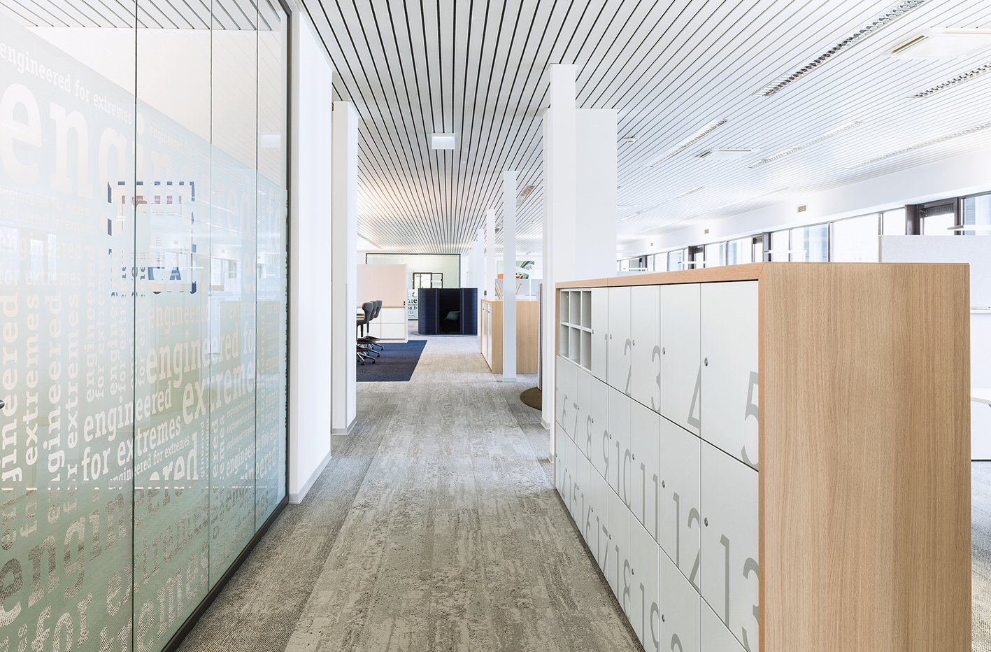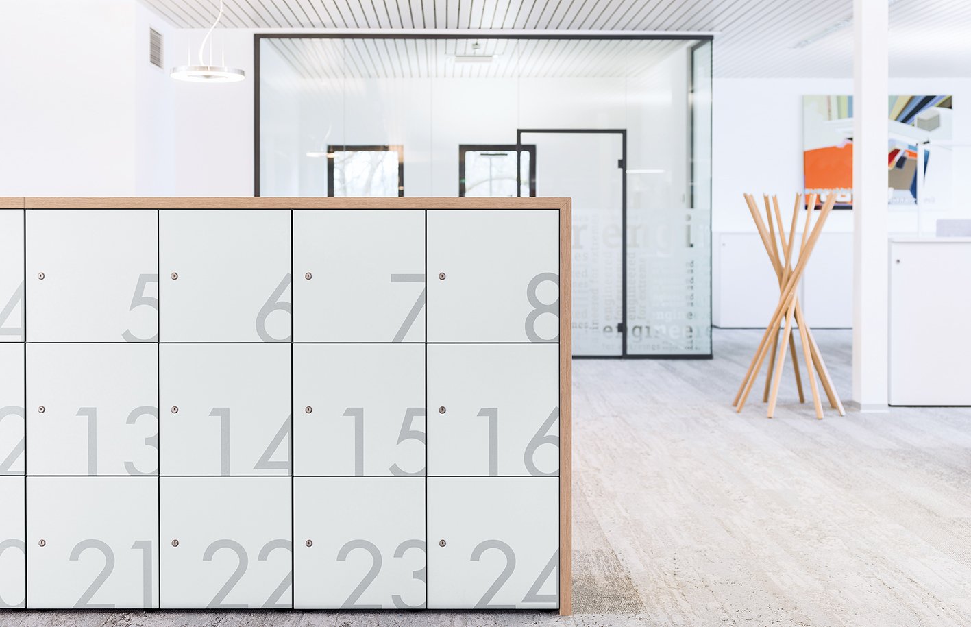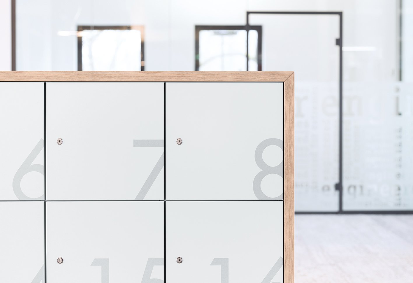 Lockerschränke bieten den Mitarbeitern persönlich zugewiesene Fächer zur Unterbringung von persönlichen Wertgegenständen. Die Fronten der Schließfachschränke wurden auf Kundenwunsch mit Zahlenmotiven gestaltet.