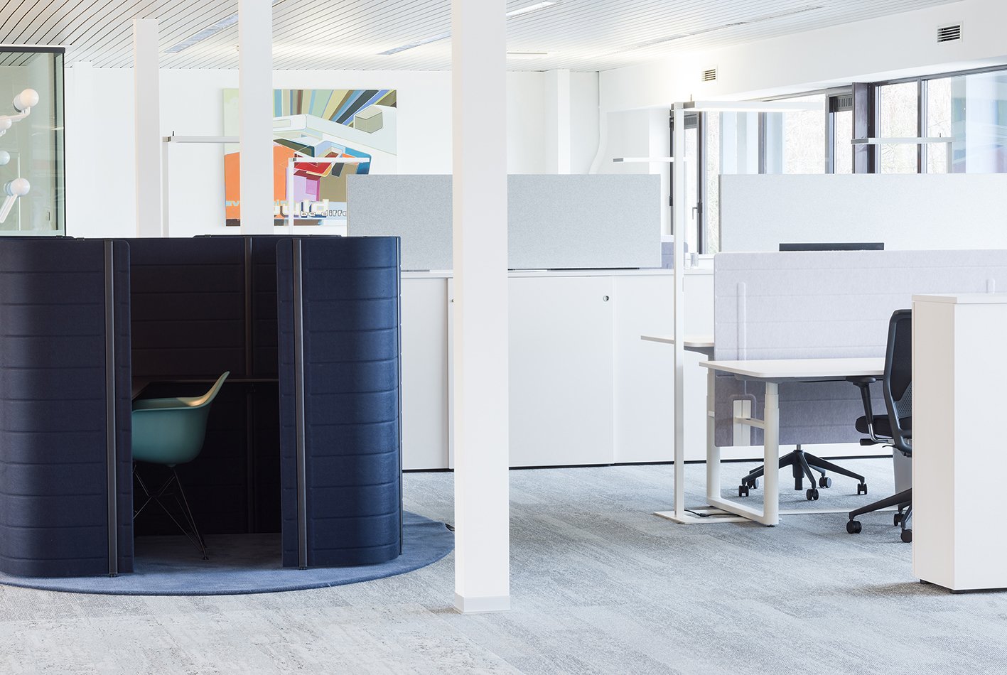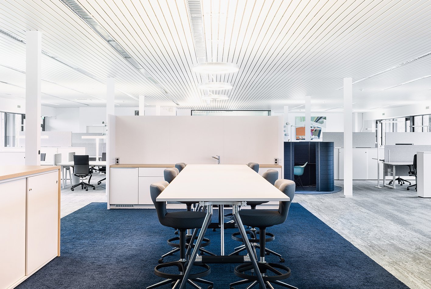 In dem neuen 'open space Büro' wurden die 3 OH Schwebe- Schiebetürschränke der Produktlinie basic S zur Raumstrukturierung eingesetzt. Teilweise sind die Schränke mit 38 mm starken Leichtstoffplatten in Eiche Dekor brückenförmig umhaust und dienen so als Kommunikationsfläche.