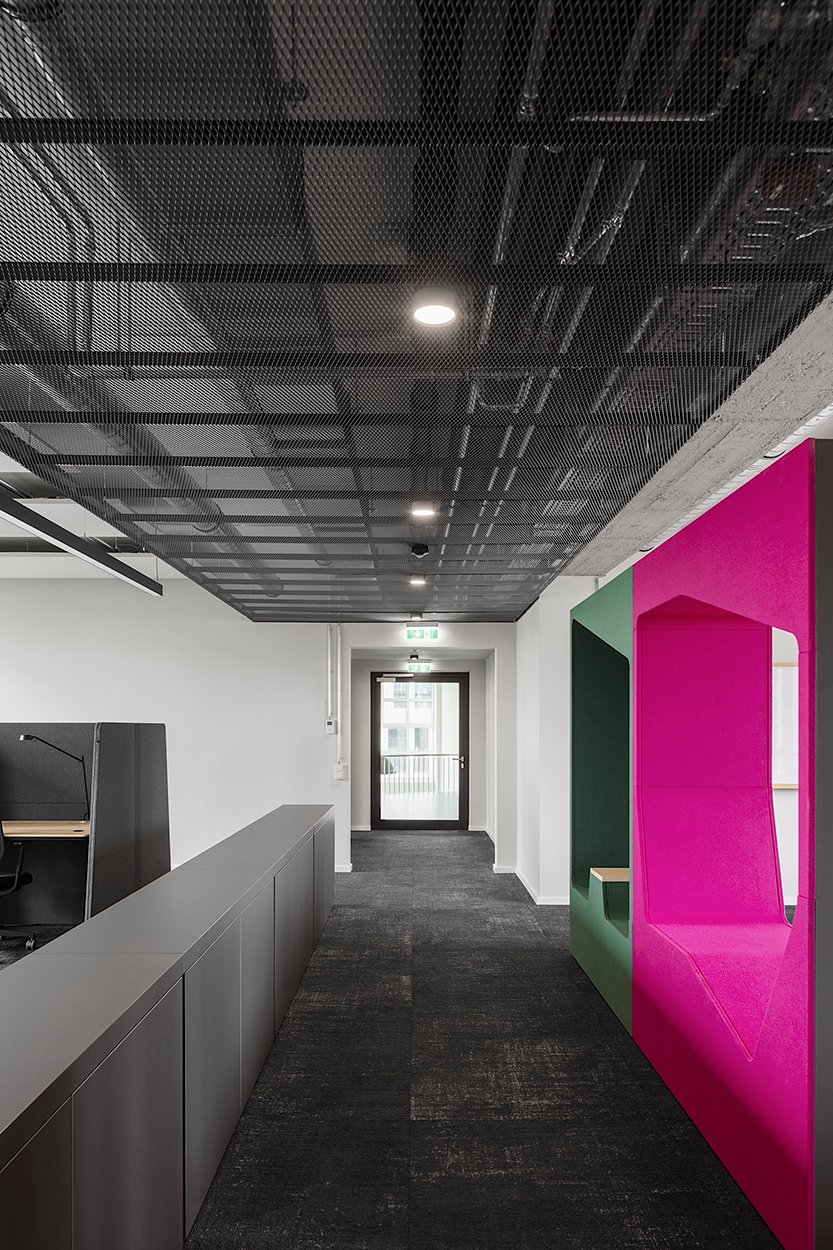In einem lebendigen Büroumfeld setzen die Schrankkojen von 'parkour' farbige Akzente, bieten Rückzugsmöglichkeiten und schaffen Struktur in der offenen Bürolandschaft. Zur Zonierung einzelner Arbeitsbereiche und für Stauraumbedarf direkt am Arbeitsplatz wurden die 'basic cap' Sideboards von werner works eingesetzt.