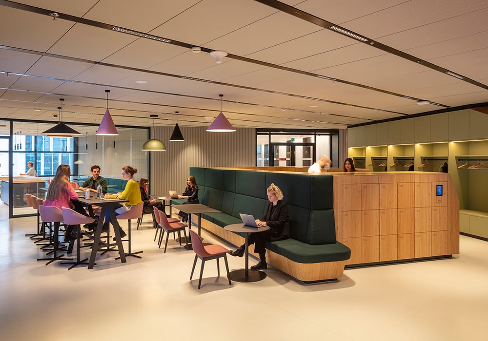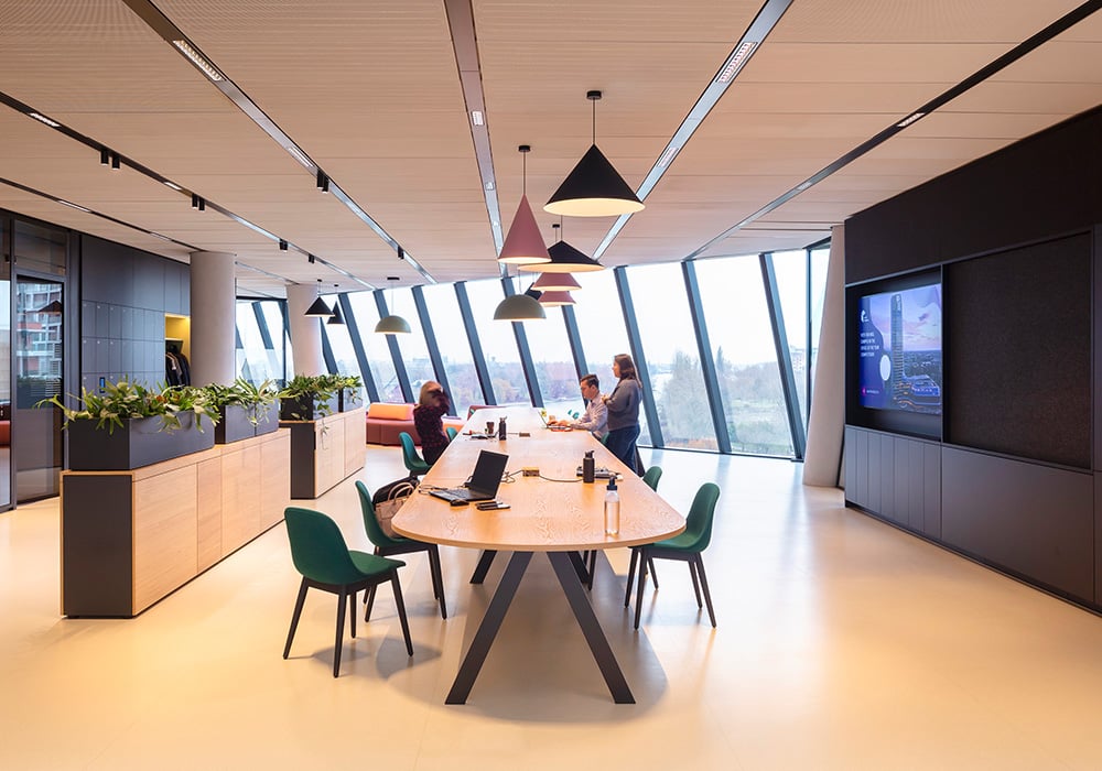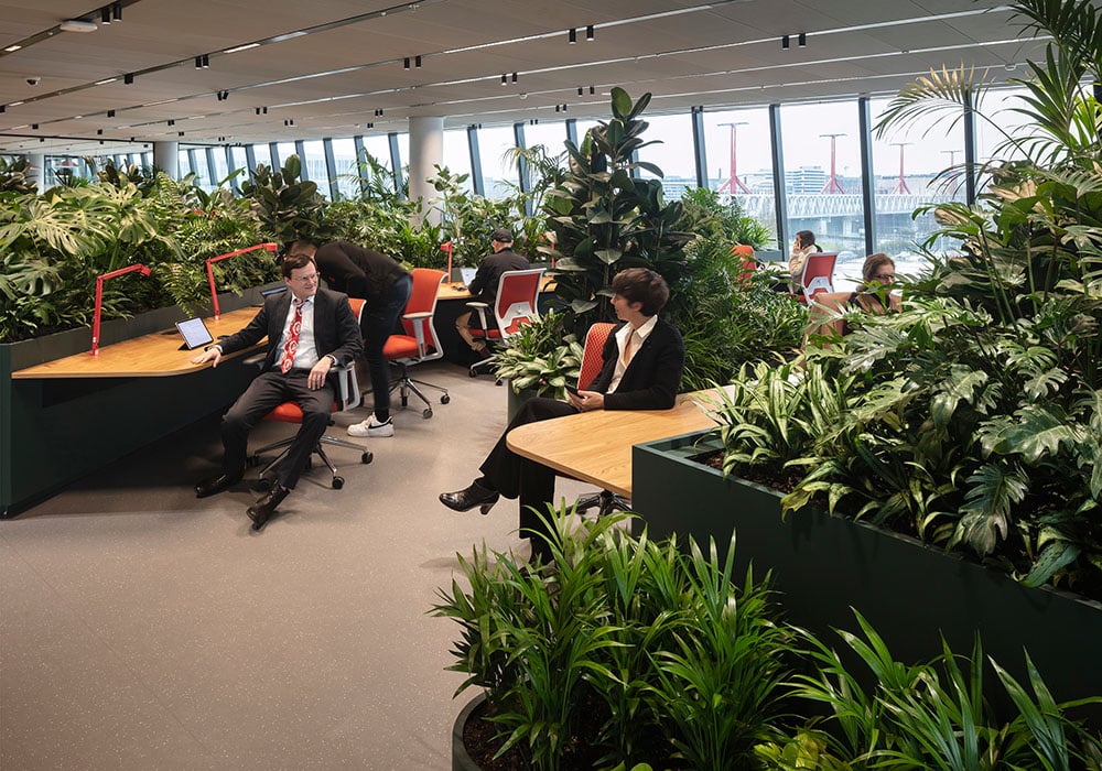 Innenarchitektonisch hat unser Partner Kinzo sich bereits 2017 in einem internationalen Wettbewerb mit seinem Konzept durchgesetzt, diesen Kulturwandel im Unternehmen mit einer agilen Arbeitswelt zu fördern. So entstand auf dem MOL-Campus eine zukunftsweisende Arbeitswelt, die durch üppige Begrünung eine besonders lebendig anmutende Umwelt schafft. Ganz passend zur nachhaltigen Strategie des Unternehmens. Eine vom städtischen Leben inspirierte Arbeitswelt, mit Orten der Gemeinschaft und des Austauschs, aber auch mit Räumen für Rückzug und Konzentration zieht sich durch alle Etagen. Ebenso wie die opulente Bepflanzung, die als zentrales Gestaltungselement regelrechte Grünräume schafft.