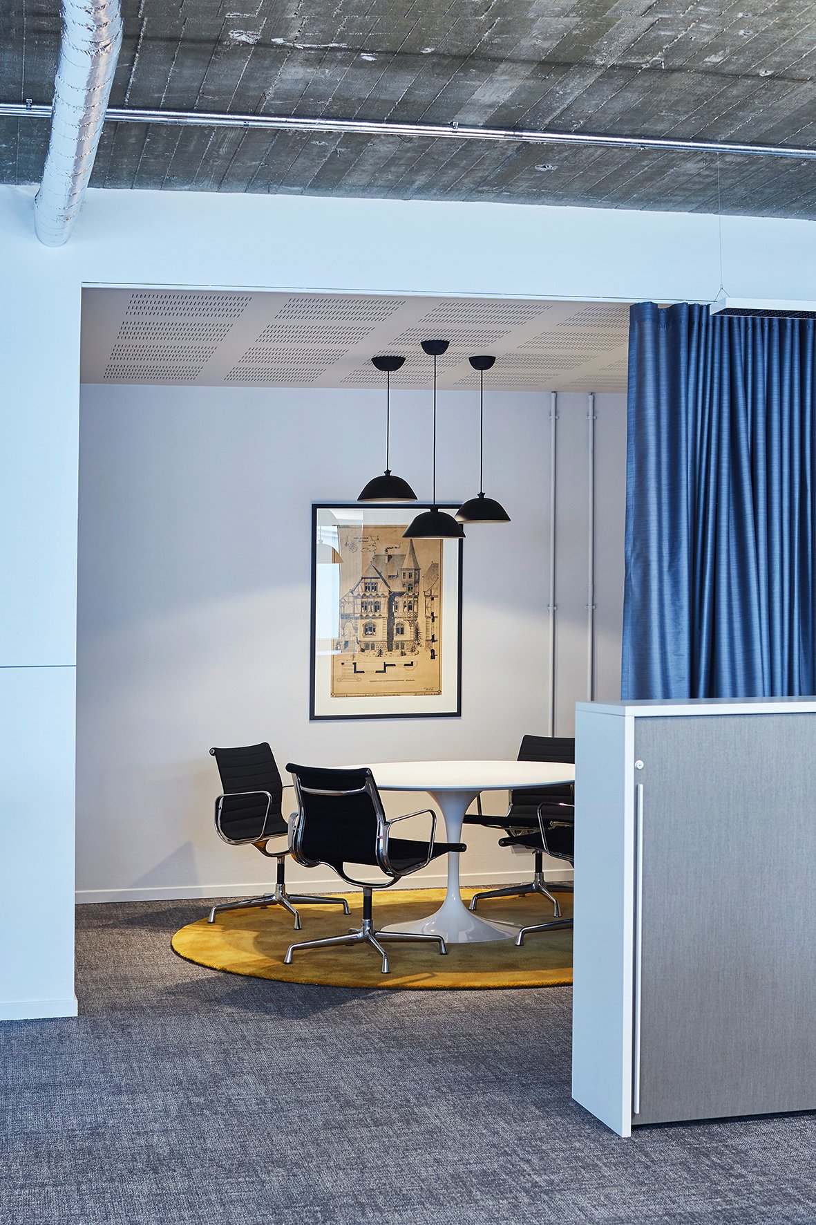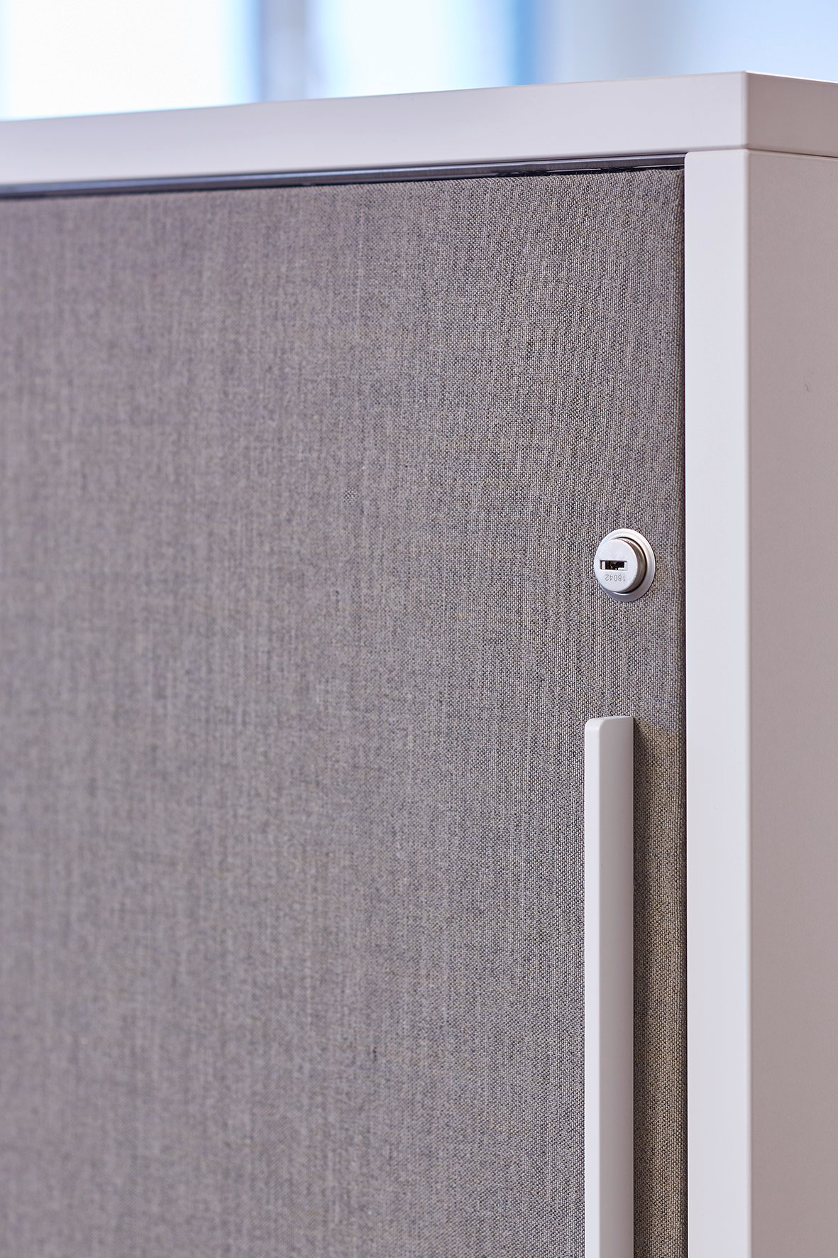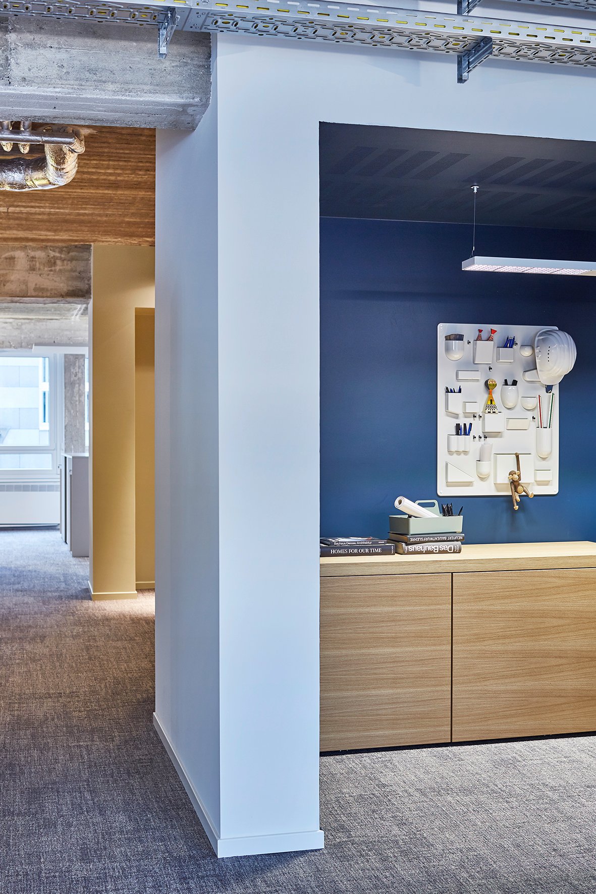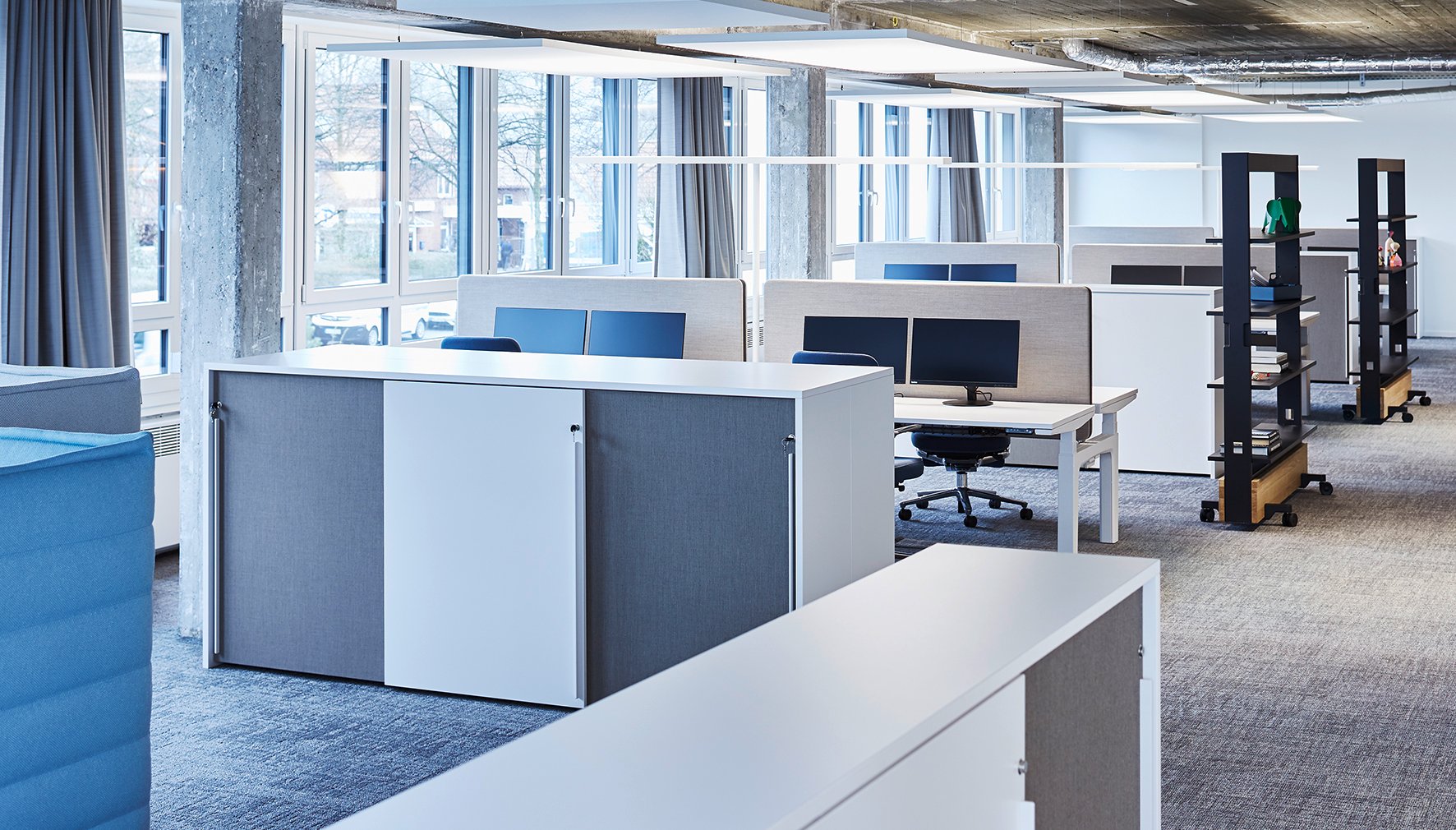 Das reduzierte und klare Design in Verbindung mit Eiche furnierten Fronten und Abdeckböden der 'basic cap' Sideboards, ist ein Pendant zu den blauen Wänden in den Besprechungs- und Technikräumen. Highboards in Stehhöhe, speziell für die Anforderungen der Mitarbeiter entwickelt, strukturieren die offenen Büroflächen und bieten zugleich eine Plattform für Kommunikation. Der Modulschrank besteht aus einzelnen Schrankkorpussen, die mit einer u-förmigen Brücke umhaust werden. Die einseitigen oder wechselseitigen Schwebetüren in Stoff oder Melamin werden im Oberboden geführt. Die Türen sind einzeln verschließbar, so dass jedem Mitarbeiter ein Modul zur persönlichen Verfügung steht. Durchgehende Griffleisten verstärken das geradlinige Design.