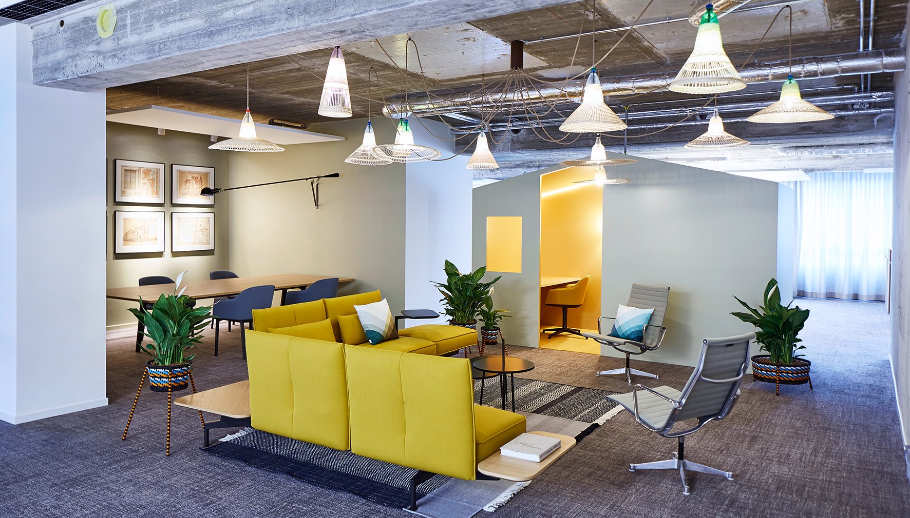 Das Wohnungsunternehmen Plambeck in Norderstedt wünschte sich die Neugestaltung der Büros in einem Gebäude der Siebzigerjahre. Der Grundriss, bislang in typischen Zellenbüros eingeteilt, bot die idealen Voraussetzungen für Arbeit in Open Space. Mutige Farben wie Knallgelb und Blau setzen Akzente in der vom Einrichtungshaus Gärtner in Hamburg neu konzipierten Büroetage. Auf der komplett entkernten Fläche mit roher Betondecke entstand ein Büro mit freier Mittelfläche, mit einzelnen Arbeitsinseln, einem Häuschen mit Thinktanks, Lounges, einer Bibliothek, vielen kleinen Nischen sowie einer Telefonzelle.