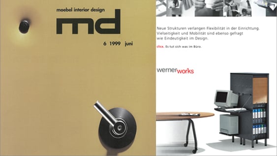 Die neue Geschäftsführung bringt die Produktlinien 'cockpit' als Empfangstheke und 'clix' ein neues Schranksystem auf den Markt. Mit 'clix' landet werner works auf dem Titelblatt der Designzeitschrift 'md'.
