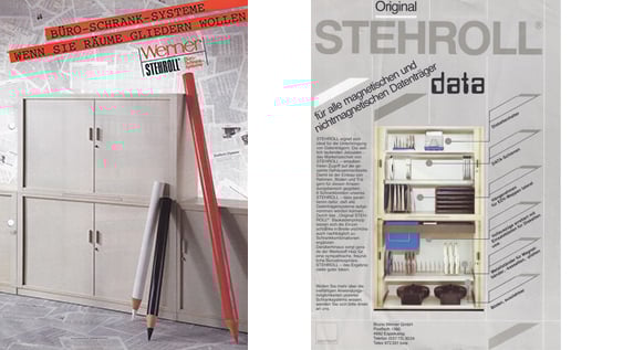 Die zunehmende Technisierung in den 80er und 90er Jahren stellte auch neue Anforderungen an den Stauraum. Datenträger wie Diskettenhalter oder Magnetbänder mussten neben den klassischen Büroutensilien in extra dafür entwickelte Ordnungssysteme verstaut werden. Aus Einzelschränken wurden Schranksysteme, die gleichzeitig auch Räume gliedern und strukturieren. Aber der 'Star' unter den Möbeln blieb bis in die 90er-Jahre der Jalousieschrank. 1991 produzierte 'Bruno Werner' 24.000 Rollschränke im Jahr.